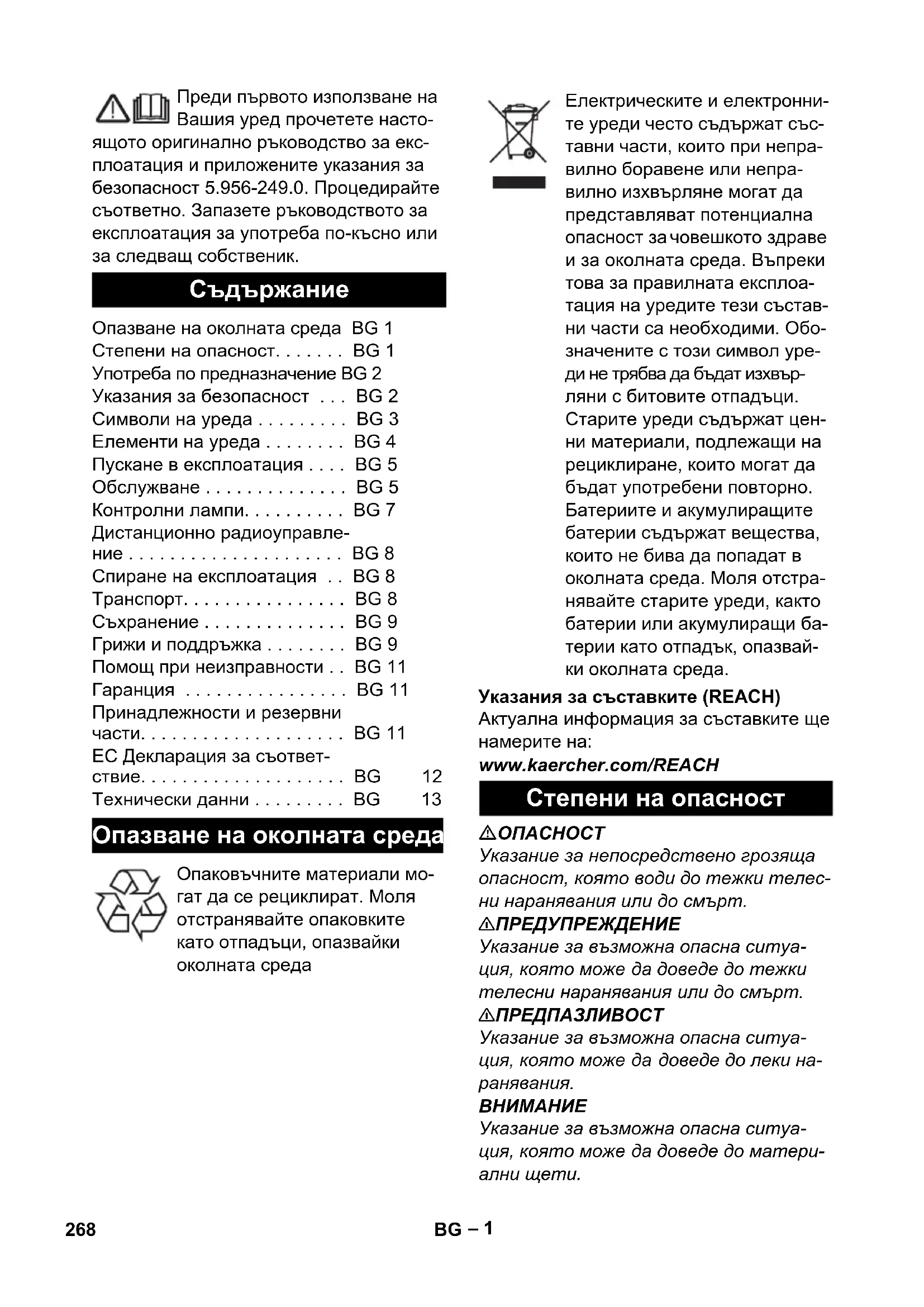 Опазване на околната среда BG 1 Степени на опасност. . . . . . . BG 1 Употреба по предназначение BG 2 Указания за безопасност . . . BG 2 Символи на уреда . . . . . . . . . BG 3 Елементи на уреда . . . . . . . . BG 4 Пускане в експлоатация . . . . BG 5 Обслужване . . . . . . . . . . . . . . BG 5 Контролни лампи. . . . . . . . . . BG 7 Дистанционно радиоуправле- ние . . . . . . . . . . . . . . . . . . . . . BG 8 Спиране на експлоатация . . BG 8 Tранспoрт. . . . . . . . . . . . . . . . BG 8 Съхранение . . . . . . . . . . . . . . BG 9 Грижи и поддръжка . . . . . . . . BG 9 Помощ при неизправности . . BG 11 Гаранция . . . . . . . . . . . . . . . . BG 11 Принадлежности и резервни части. . . . . . . . . . . . . . . . . . . . BG 11 EC Декларация за съответ- ствие. . . . . . . . . . . . . . . . . . . . BG 12 Технически данни . . . . . . . . . BG 13 Опазване на околната среда Опаковъчните материали мо- гат да се рециклират. Моля отстранявайте опаковките като отпадъци, опазвайки околната среда Електрическите и електронни- те уреди често съдържат със- тавни части, които при непра- вилно боравене или непра- вилно изхвърляне могат да представляват потенциална опасност за човешкото здраве и за околната среда. Въпреки това за правилната експлоа- тация на уредите тези състав- ни части са необходими. Обо- значените с този символ уре- ди не трябва да бъдат изхвър- ляни с битовите отпадъци. Старите уреди съдържат цен- ни материали, подлежащи на рециклиране, които могат да бъдат употребени повторно. Батериите и акумулиращите батерии съдържат вещества, които не бива да попадат в околната среда. Моля отстра- нявайте старите уреди, както батерии или акумулиращи ба- терии като отпадък, опазвай- ки околната среда. Степени на опасност 268 BG– 2 – Тази прахосмукачка е подходяща за мокро и сухо почистване на подови и стенни повърхности. – Този уред е подходящ за изсмукване на сухи, незапалими прахове от ма-