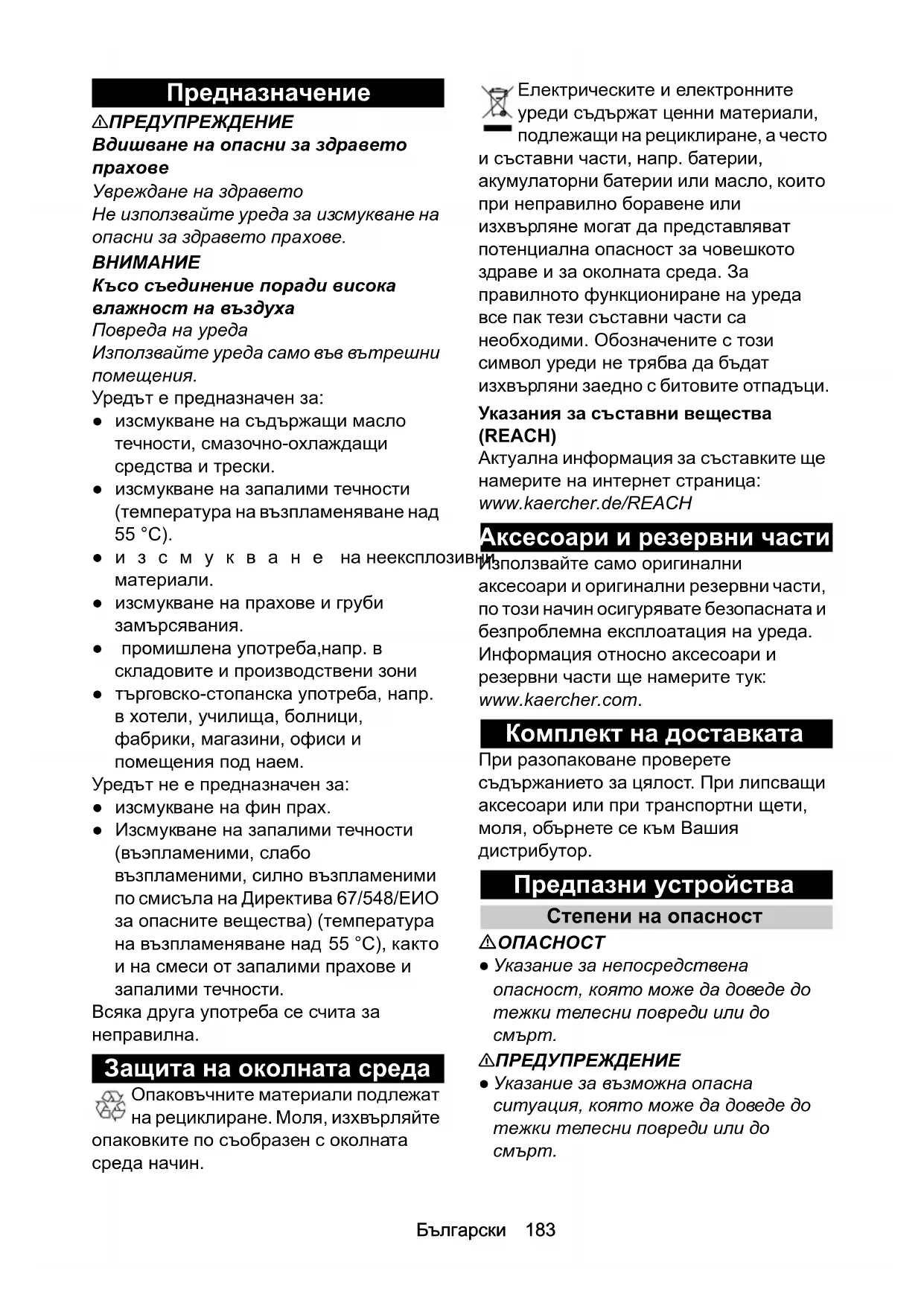 . Обозначените с този символ уреди не трябва да бъдат изхвърляни заедно с битовите отпадъци. Указания за съставни вещества (REACH) Актуална информация за съставките ще намерите на интернет страница: www.kaercher.de/REACH Аксесоари и резервни части Използвайте само оригинални аксесоари и оригинални резервни части, по този начин осигурявате безопасната и безпроблемна експлоатация на уреда. Информация относно аксесоари и резервни части ще намерите тук: www.kaercher.com. Комплект на доставката При разопаковане проверете съдържанието за цялост. При липсващи аксесоари или при транспортни щети, моля, обърнете се към Вашия дистрибутор. Предпазни устройства Степени на опасност