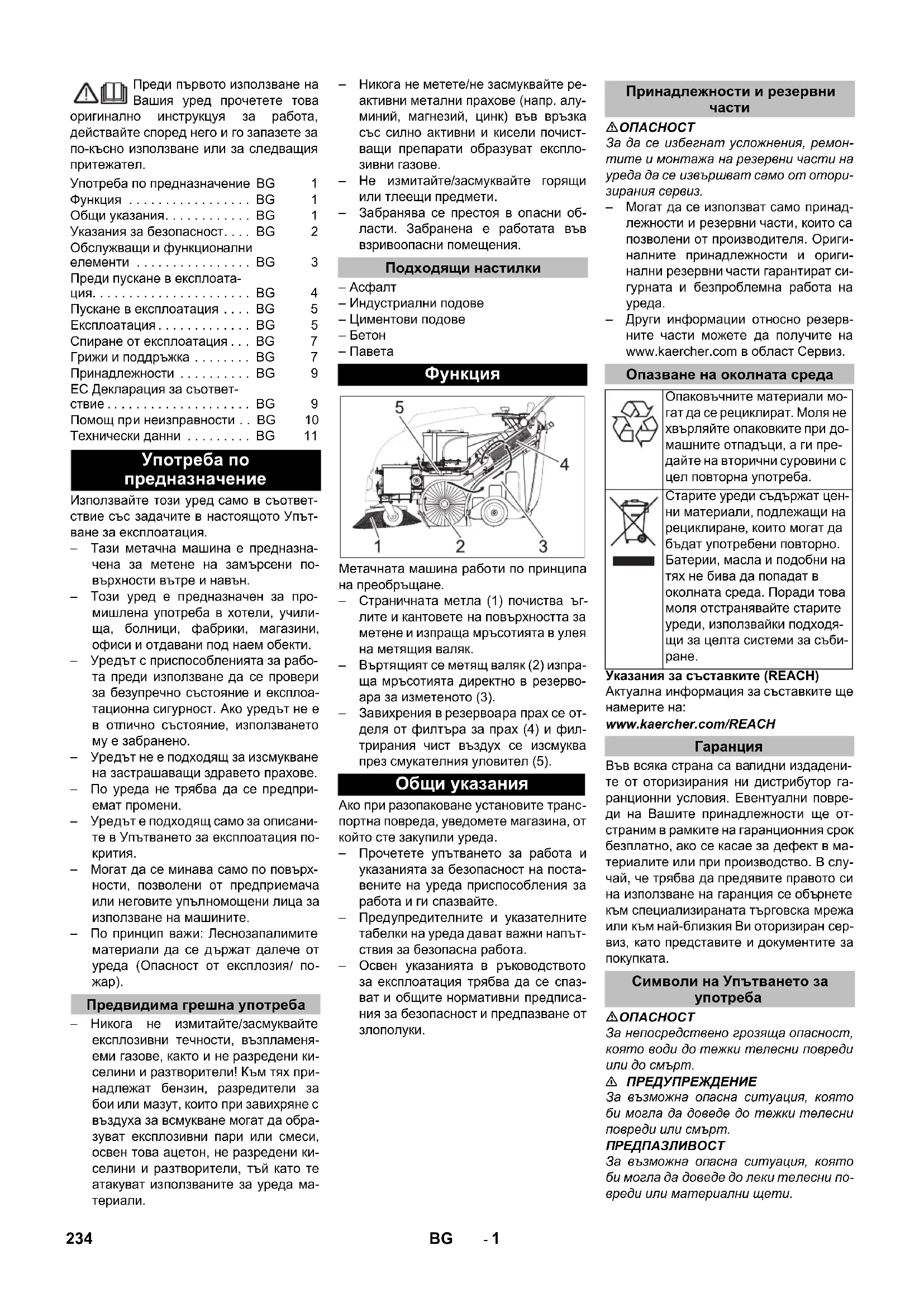 Пълномощник по документацията: S. Reiser Alfred Kärcher SE & Co. KG Alfred-Kärcher-Straße 28-40 71364 Winnenden (Germany) Tel.: +49 7195 14-0 Fax: +49 7195 14-2212 Winnenden, 2021/02/01 Смяна на филтъра за прах Сменете предпазителите/релетата Принадлежности Странични метли,