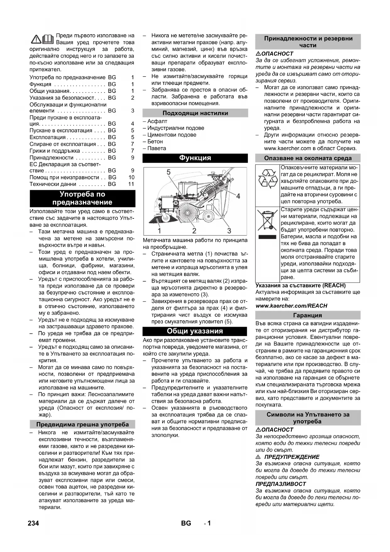 0,2 0,2 233SR- 1 Преди първото използване на Вашия уред прочетете това оригинално инструкцуя за работа, действайте според него и го запазете за по-късно използване или за следващия притежател. Използвайте този уред само в съответ- ствие със задачите в настоящото Упът- ване за експлоатация. – Тази метачна машина е предназна- чена за метене на замърсени по-