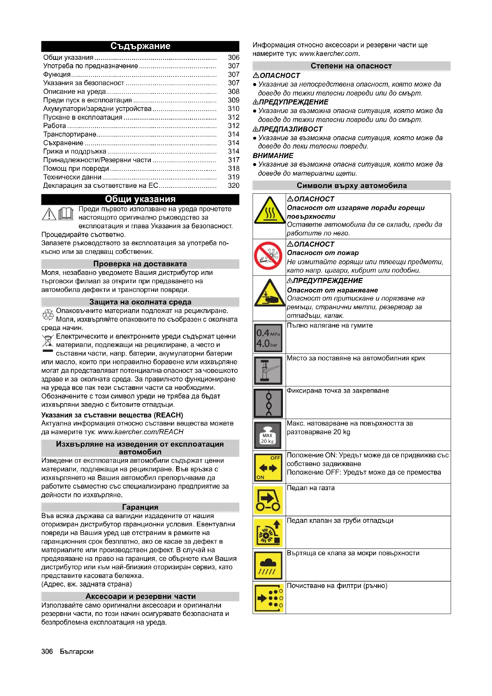 Общи указания Преди първото използване на уреда прочетете настоящото оригинално ръководство за експлоатация и глава Указания за безопасност. Процедирайте съответно. Запазете ръководството за експлоатация за употреба по- късно или за следващ собственик. Проверка на доставката Моля, незабавно уведомете Вашия дистрибутор или търговски филиал за открити при предаването на автомобила дефекти и транспортни повреди. Защита на околната среда Опаковъчните материали подлежат на рециклиране. Моля, изхвърляйте опаковките по съобразен с околната среда начин. Електрическите и електронните уреди съдържат ценни материали, подлежащи на рециклиране, а често и съставни части, напр. батерии, акумулаторни батерии или масло, които при неправилно боравене или изхвърляне могат да представляват потенциална опасност за човешкото здраве и за околната среда. За правилното функциониране на уреда все пак тези съставни части са необходими. Обозначените с този символ уреди не трябва да бъдат изхвърляни заедно с битовите отпадъци. Указания за съставни вещества (REACH) Актуална информация относно съставни вещества можете да намерите тук: www.kaercher.com/REACH Изхвърляне на изведения от експлоатация