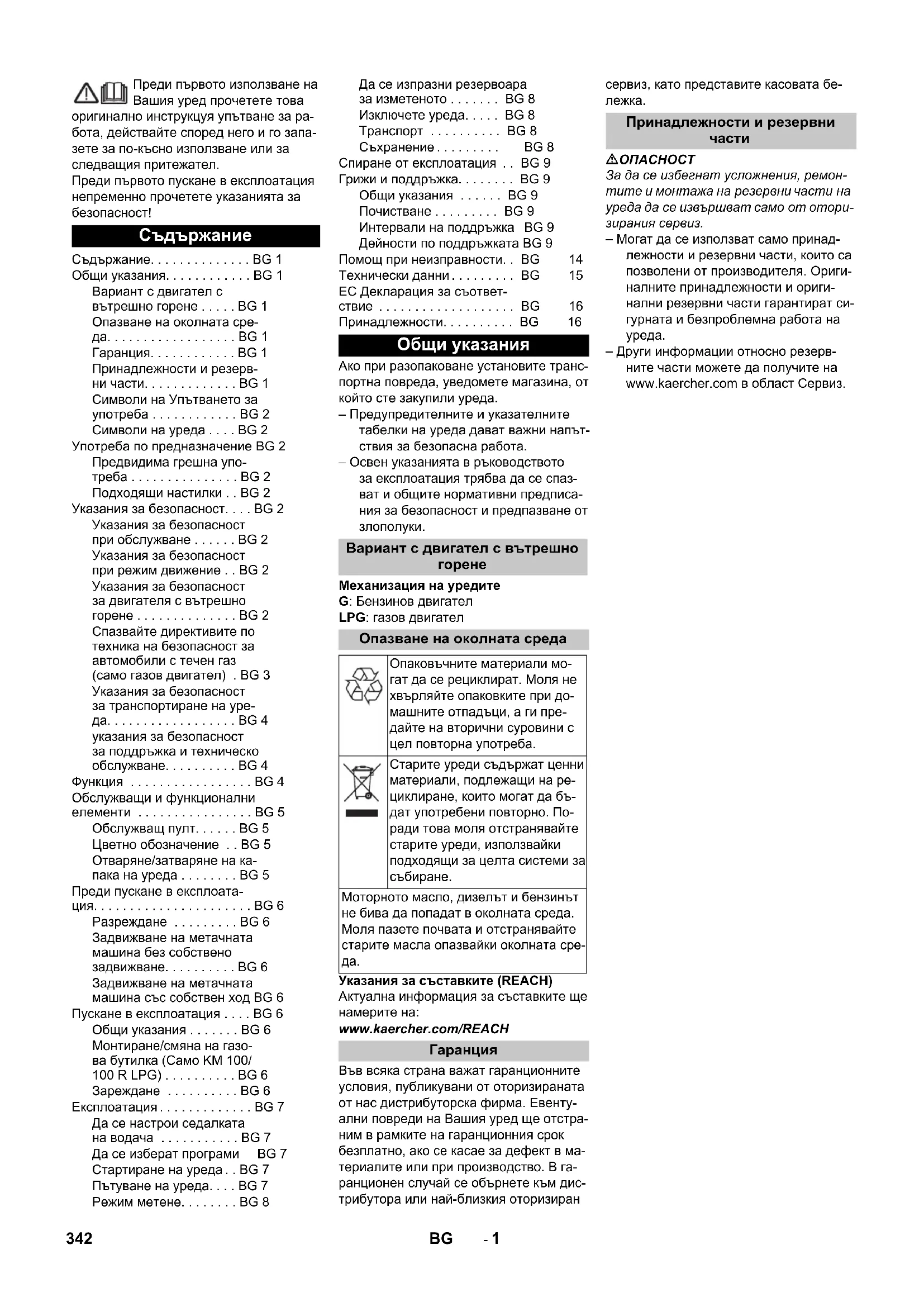 Зареждане . . . . . . . . . . BG 6 Експлоатация . . . . . . . . . . . . . BG 7 Да се настрои седалката на водача . . . . . . . . . . . BG 7 Да се изберат програми BG 7 Стартиране на уреда . . BG 7 Пътуване на уреда. . . . BG 7 Режим метене. . . . . . . . BG 8 Да се изпразни резервоара за изметеното . . . . . . . BG 8 Изключете уреда. . . . . BG 8 Транспорт . . . . . . . . . . BG 8 Съхранение . . . . . . . . . BG 8 Спиране от експлоатация . . BG 9 Грижи и поддръжка. . . . . . . . BG 9 Общи указания . . . . . . BG 9 Почистване . . . . . . . . . BG 9 Интервали на поддръжка BG 9 Дейности по поддръжката BG 9 Помощ при неизправности. . BG 14 Технически данни . . . . . . . . . BG 15 EC Декларация за съответ- ствие . . . . . . . . . . . . . . . . . . . BG 16 Принадлежности. . . . . . . . . . BG 16 Общи указания Вариант с двигател с вътрешно