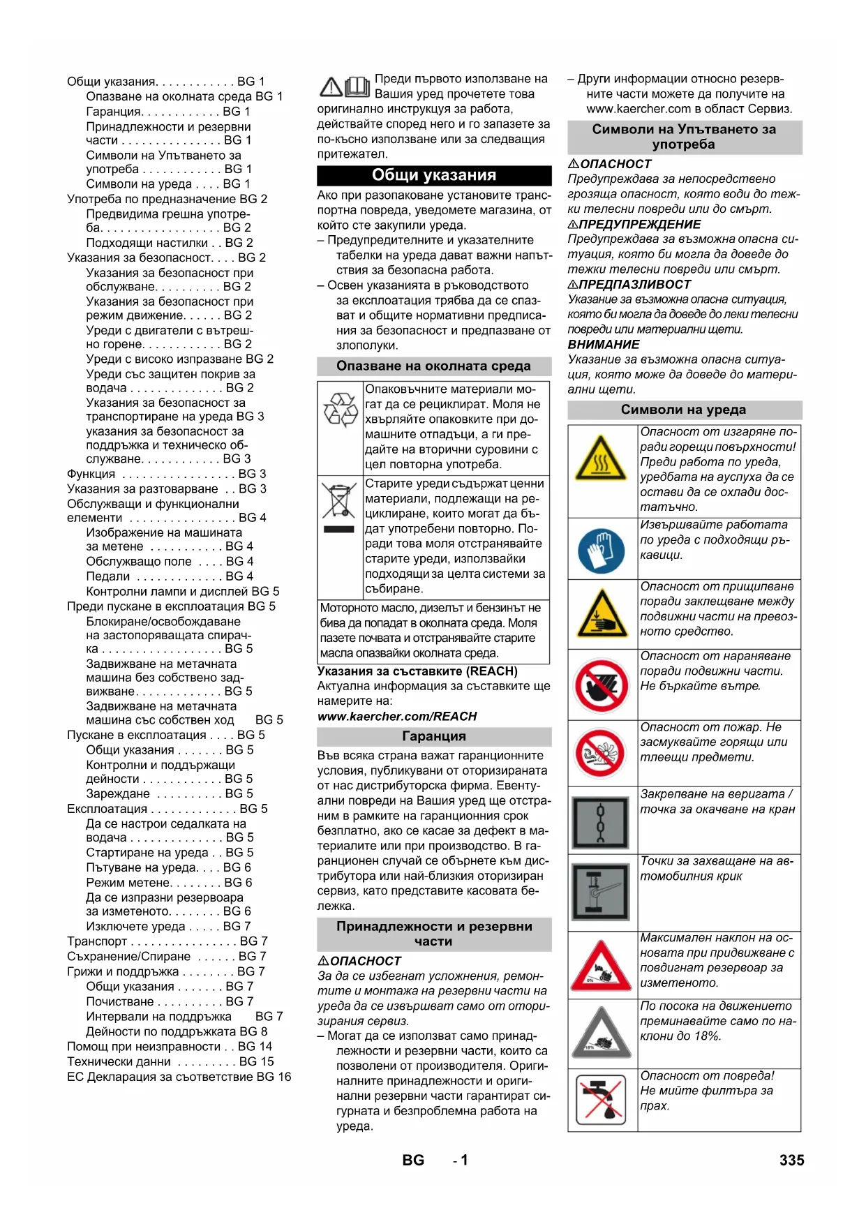 Общи указания. . . . . . . . . . . . BG 1 Опазване на околната среда BG 1 Гаранция. . . . . . . . . . . . BG 1 Принадлежности и резервни части . . . . . . . . . . . . . . . BG 1 Символи на Упътването за употреба . . . . . . . . . . . . BG 1 Символи на уреда . . . . BG 1 Употреба по предназначение BG 2 Предвидима грешна употре- ба. . . . . . . . . . . . . . . . . . BG 2 Подходящи настилки . . BG 2 Указания за безопасност. . . . BG 2 Указания за безопасност при обслужване. . . . . . . . . . BG 2 Указания за безопасност при режим движение. . . . . . BG 2 Уреди с двигатели с вътреш- но горене. . . . . . . . . . . . BG 2 Уреди с високо изпразване BG 2 Уреди със защитен покрив за водача . . . . . . . . . . . . . . BG 2 Указания за безопасност за транспортиране на уреда BG 3 указания за безопасност за поддръжка и техническо об- служване. . . . . . . . . . . . BG 3 Функция . . . . . . . . . . . . . . . . . BG 3 Указания за разтоварване . . BG 3 Обслужващи и функционални елементи . . . . . . . . . . . . . . . . BG 4 Изображение на машината за метене . . . . . . . . . . . BG 4 Обслужващо поле . . . . BG 4 Педали . . . . . . . . . . . . . BG 4 Контролни лампи и дисплей BG 5 Преди пускане в експлоатация BG 5 Блокиране/освобождаване на застопоряващата спирач- ка . . . . . . . . . . . . . . . . . . BG 5 Задвижване на метачната машина без собствено зад- вижване. . . . . . . . . . . . . BG 5 Задвижване на метачната машина със собствен ход BG 5 Пускане в експлоатация . . . . BG 5 Общи указания . . . . . . . BG 5 Контролни и поддържащи дейности . . . . . . . . . . . . BG 5 Зареждане . . . . . . . . . . BG 5 Експлоатация . . . . . . . . . . . . . BG 5 Да се настрои седалката на водача . . . . . . . . . . . . . . BG 5 Стартиране на уреда . . BG 5 Пътуване на уреда. . . . BG 6 Режим метене. . . . . . . . BG 6 Да се изпразни резервоара за изметеното. . . . . . . . BG 6 Изключете уреда . . . . . BG 7 Транспорт . . . . . . . . . . . . . . . . BG 7 Съхранение/Спиране . . . . . . BG 7 Грижи и поддръжка . . . . . . . . BG 7 Общи указания . . . . . . . BG 7 Почистване . . . . . . . . . . BG 7 Интервали на поддръжка BG 7 Дейности по поддръжката BG 8 Помощ при неизправности . . BG 14 Технически данни . . . . . . . . . BG 15 EC Декларация за съответствие BG 16 Общи указания Опазване на околната среда Опаковъчните материали мо- гат да се рециклират. Моля не хвърляйте опаковките при до- машните отпадъци, а ги пре- дайте на вторични суровини с цел повторна употреба. Старите уреди съдържат ценни материали, подлежащи на ре- циклиране, които могат да бъ- дат употребени повторно. По- ради това моля отстранявайте старите уреди, използвайки подходящи за целта системи за