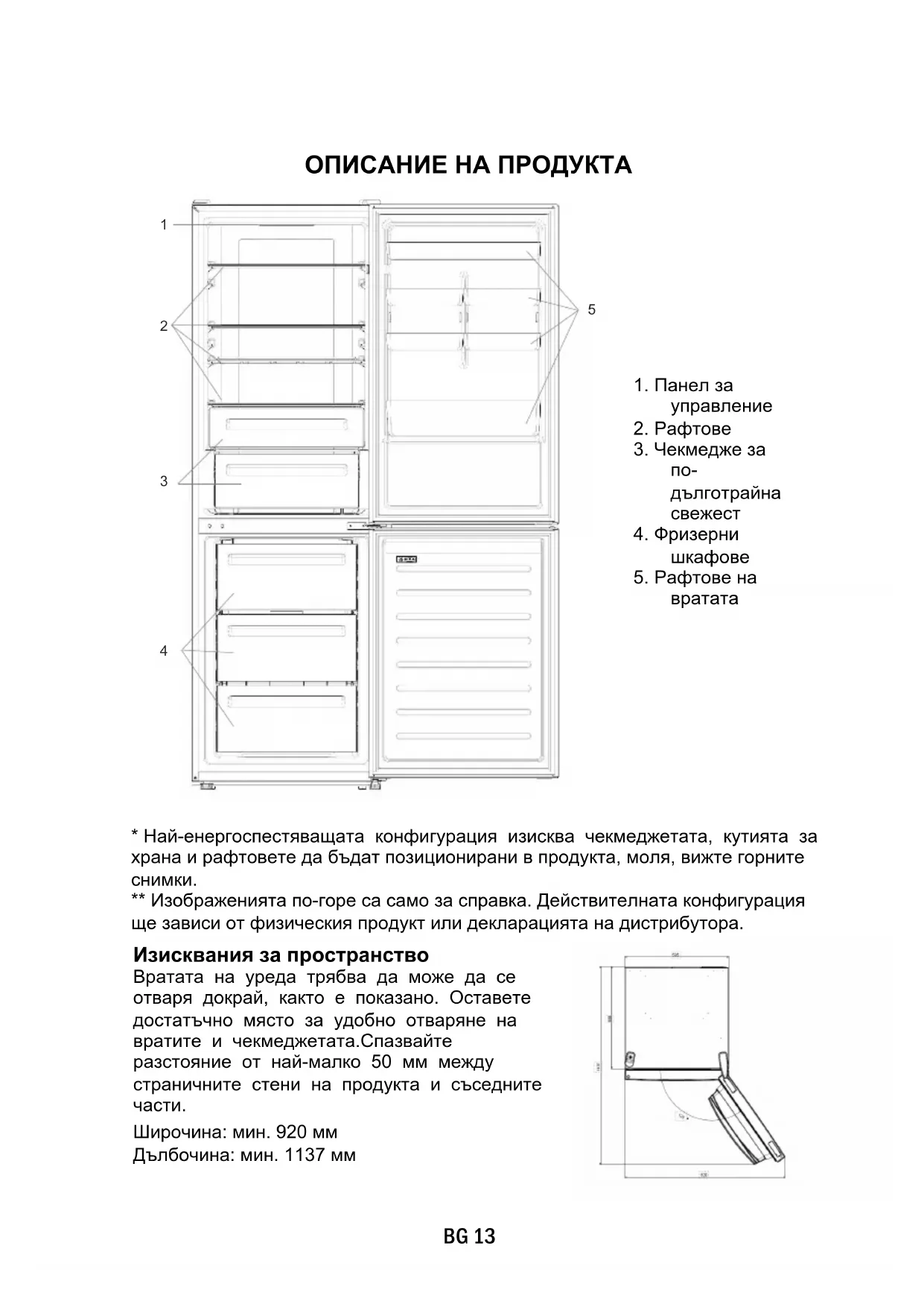 - Най-енергоспестяващата конфигурация изисква чекмеджетата, кутията за храна и рафтовете да бъдат позиционирани в продукта, моля, вижте горните
