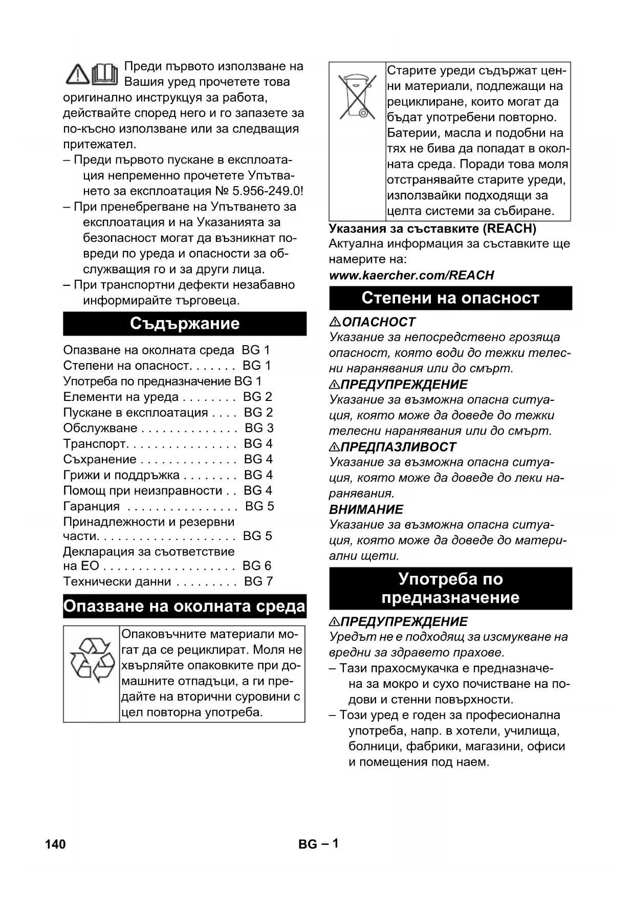 Br. dela Dužina kabla EU 6.649-915.0 10 m GB 6.650-151.0 10 m CH 6.650-292.0 10 m AU 6.650-166.0 10 m 139SR– 1 Преди първото използване на Вашия уред прочетете това оригинално инструкцуя за работа, действайте според него и го запазете за по-късно използване или за следващия притежател. – Преди първото пускане в експлоата- ция непременно прочетете Упътва- нето за експлоатация № 5.956-249.0! – При пренебрегване на Упътването за експлоатация и на Указанията за безопасност могат да възникнат по- вреди по уреда и опасности за об- служващия го и за други лица. – При транспортни дефекти незабавно информирайте търговеца. Указания за съставките (REACH) Актуална информация за съставките ще намерите на: www.kaercher.com/REACH