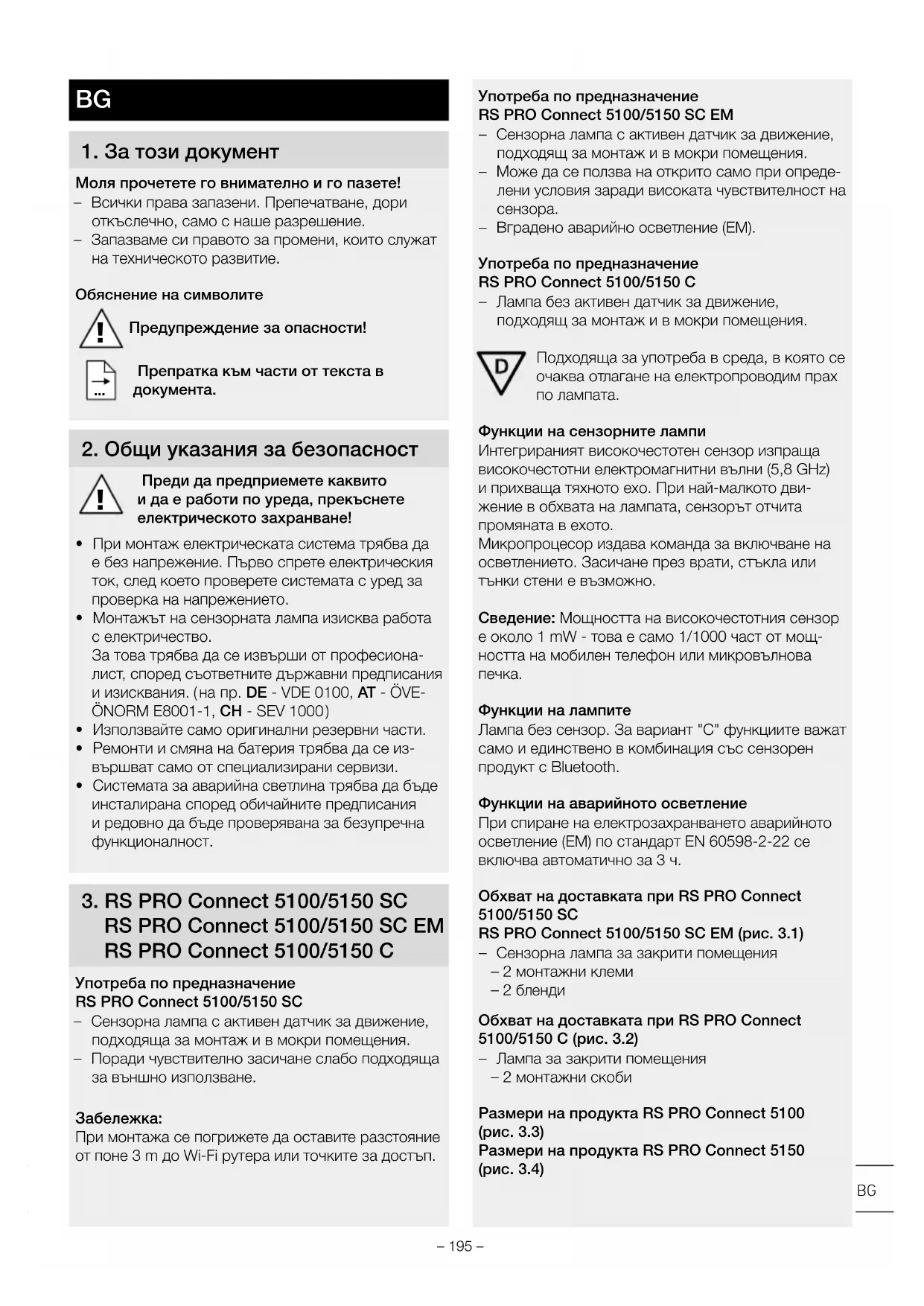 – Вградено аварийно осветление (EM). Употреба по предназначение RS PRO Connect 5100/5150 C – Лампа без активен датчик за движение, подходящ за монтаж и в мокри помещения. Подходяща за употреба в среда, в която се очаква отлагане на електропроводим прах по лампата. Функции на сензорните лампи Интегрираният високочестотен сензор изпраща високочестотни електромагнитни вълни (5,8 GHz) и прихваща тяхното ехо. При най-малкото дви- жение в обхвата на лампата, сензорът отчита промяната в ехото. Микропроцесор издава команда за включване на осветлението. Засичане през врати, стъкла или тънки стени е възможно. Сведение: Мощността на високочестотния сензор е около 1 mW - това е само 1/1000 част от мощ- ността на мобилен телефон или микровълнова