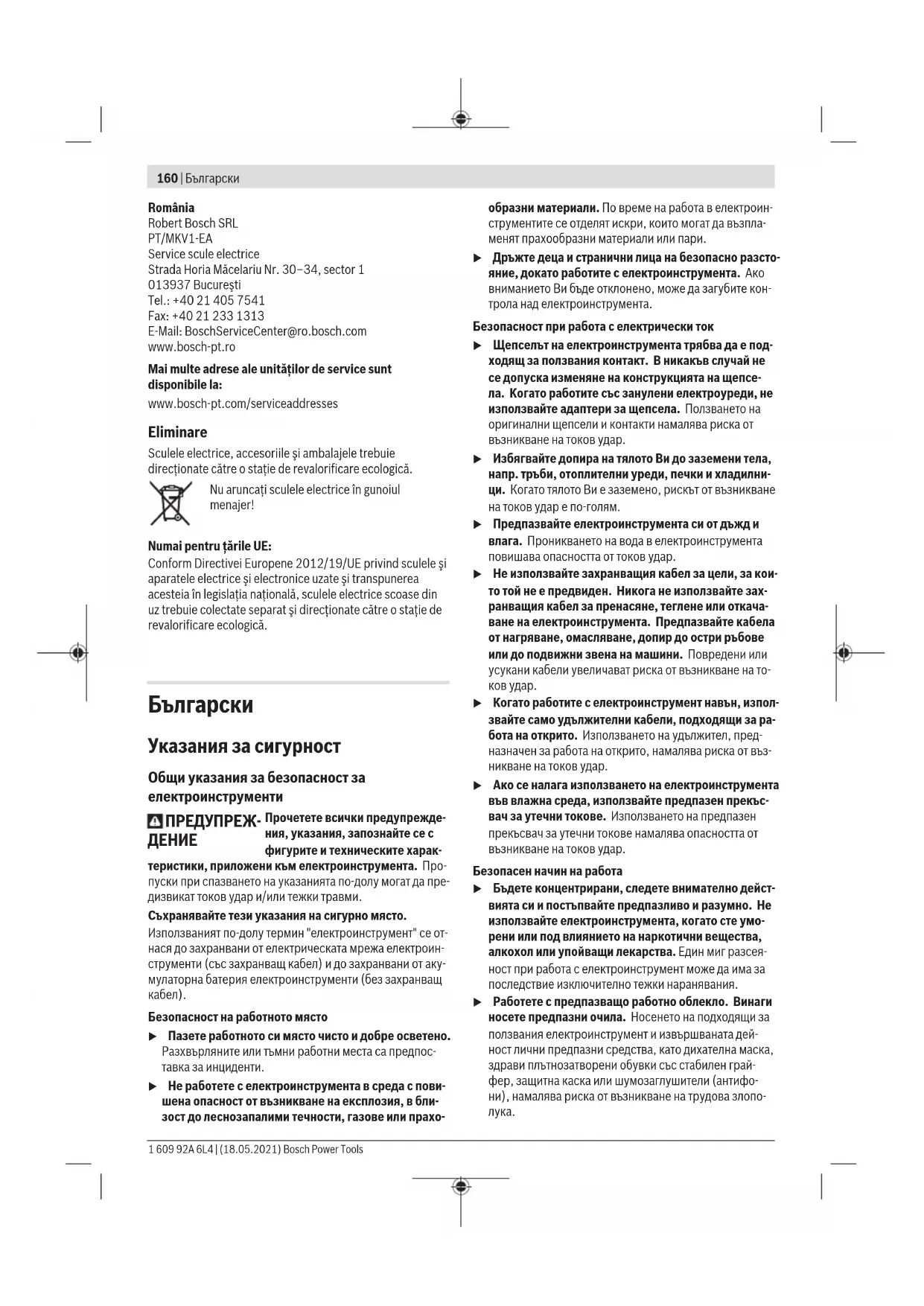 u Допускайте ремонтът на електроинструментите Ви да се извършва само от квалифицирани специалис- ти и само с използването на оригинални резервни части. По този начин се гарантира съхраняване на бе- зопасността на електроинструмента. Указания за безопасна работа с винтоверти u Когато изпълнявате операция, при която съществу- ва опасност фиксаторът да засегне скрити под по- върхността проводници под напрежение или зах- ранващия кабел, допирайте електроинструмента само до изолираните повърхности на ръкохватките. При контакт на фиксатора с проводник под напреже- ние е възможно напрежението да се предаде по метал- ните детайли на електроинструмента и това да предиз- вика токов удар. u Използвайте подходящи прибори, за да откриете евентуално скрити под повърхността тръбопрово- ди, или се обърнете към съответното местно снаб- дително дружество. Влизането в съприкосновение с проводници под напрежение може да предизвика по- жар и токов удар. Увреждането на газопровод може да доведе до експлозия. Повреждането на водопровод има за последствие големи материални щети и може да предизвика токов удар. Bosch Power Tools 1 609 92A 6L4 | (18.05.2021)162 | Български u Дръжте електроинструмента здраво. При завиване и развиване на винтове могат рязко да възникнат сил- ни реакционни моменти. u Осигурявайте обработвания детайл. Детайл, захва- нат с подходящи приспособления или скоби, е засто- порен по здраво и сигурно, отколкото, ако го държите
