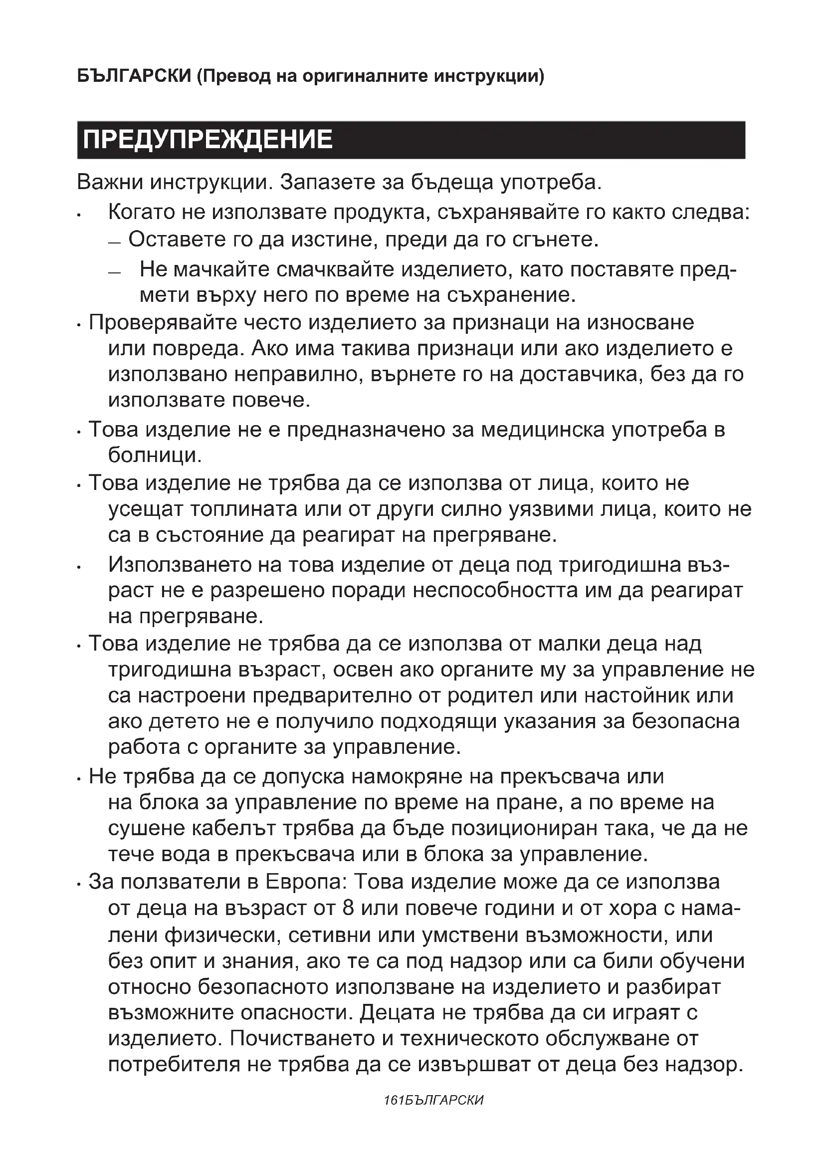 - Това изделие не трябва да се използва от малки деца над тригодишна възраст, освен ако органите му за управление не са настроени предварително от родител или настойник или ако детето не е получило подходящи указания за безопасна работа с органите за управление.