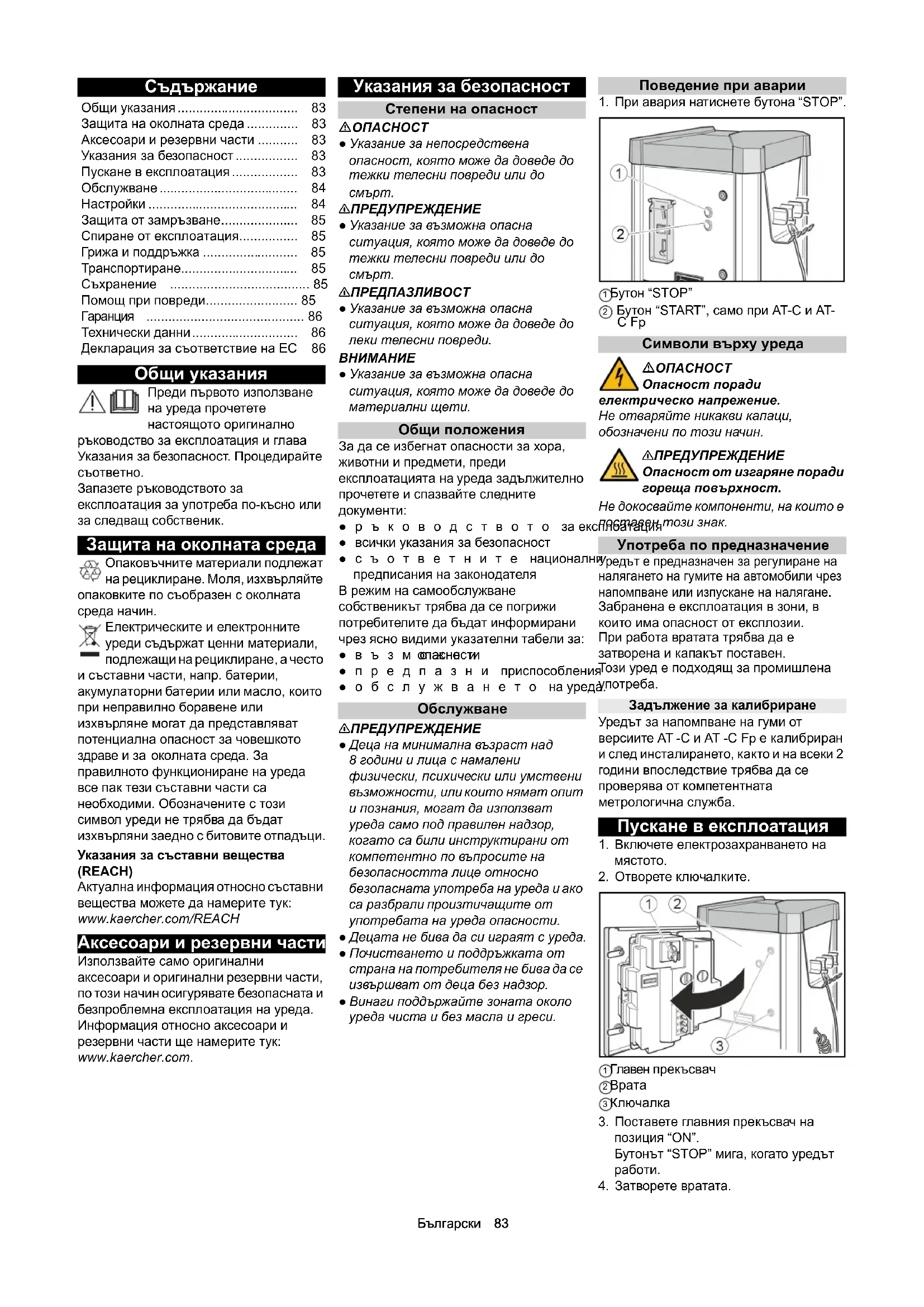 Запазете ръководството за експлоатация за употреба по-късно или за следващ собственик. Защита на околната среда Опаковъчните материали подлежат на рециклиране. Моля, изхвърляйте опаковките по съобразен с околната среда начин. Електрическите и електронните уреди съдържат ценни материали, подлежащи на рециклиране, а често и съставни части, напр. батерии, акумулаторни батерии или масло, които при неправилно боравене или изхвърляне могат да представляват потенциална опасност за човешкото здраве и за околната среда. За правилното функциониране на уреда все пак тези съставни части са необходими. Обозначените с този символ уреди не трябва да бъдат изхвърляни заедно с битовите отпадъци. Указания за съставни вещества (REACH) Актуална информация относно съставни вещества можете да намерите тук: www.kaercher.com/REACH Аксесоари и резервни части Използвайте само оригинални аксесоари и оригинални резервни части, по този начин осигурявате безопасната и безпроблемна експлоатация на уреда. Информация относно аксесоари и резервни части ще намерите тук: www.kaercher.com. Указания за безопасност Степени на опасност