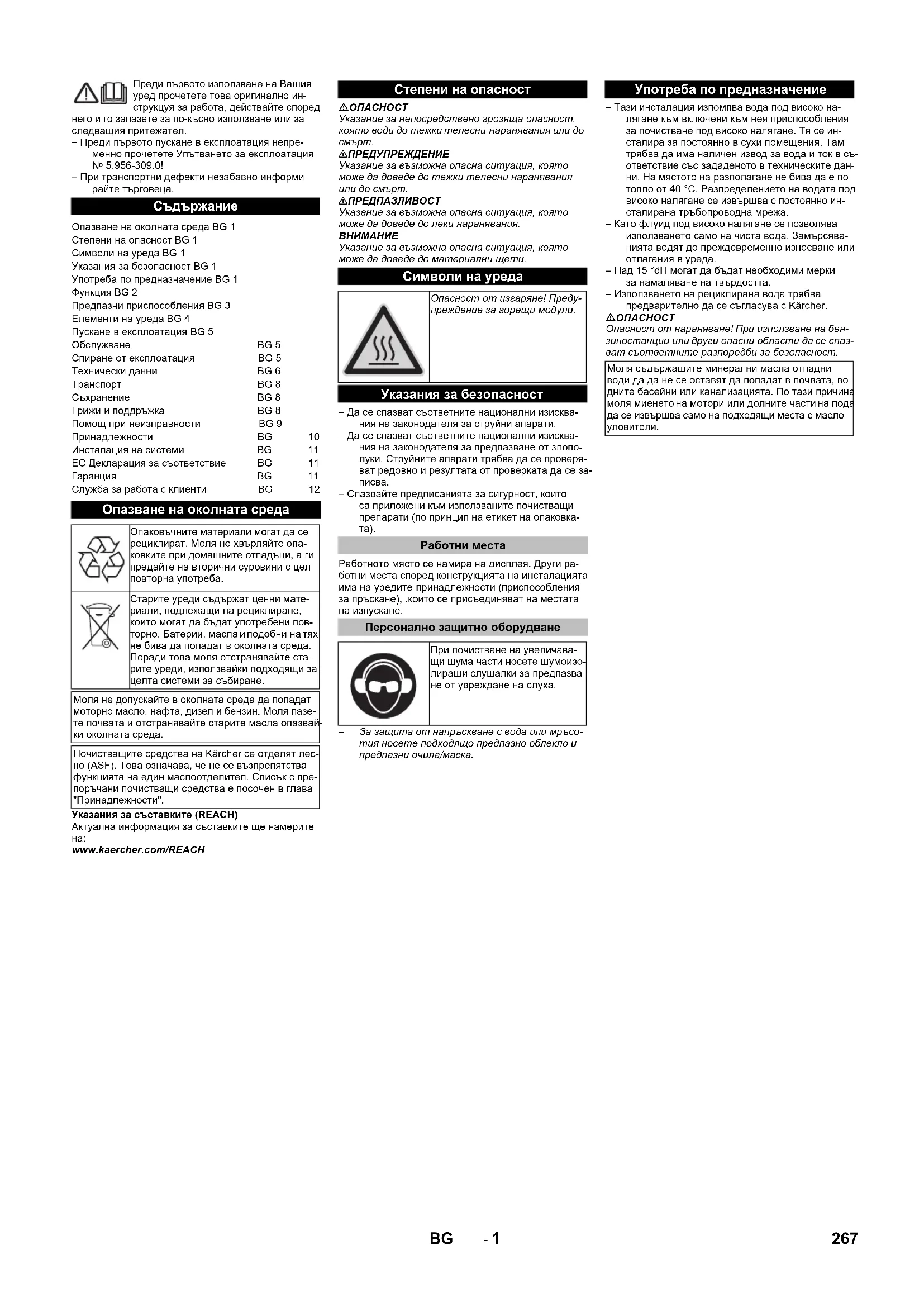 Опазване на околната среда BG 1 Степени на опасност BG 1 Символи на уреда BG 1 Указания за безопасност BG 1 Употреба по предназначение BG 1 Функция BG 2 Предпазни приспособления BG 3 Елементи на уреда BG 4 Пускане в експлоатация BG 5 Обслужване BG 5 Спиране от експлоатация BG 5 Технически данни BG 6 Tранспoрт BG 8 Съхранение BG 8 Грижи и поддръжка BG 8 Помощ при неизправности BG 9 Принадлежности BG 10 Инсталация на системи BG 11 EC Декларация за съответствие BG 11 Гаранция BG 11 Служба за работа с клиенти BG 12 Опазване на околната среда Опаковъчните материали могат да се рециклират. Моля не хвърляйте опа- ковките при домашните отпадъци, а ги предайте на вторични суровини с цел повторна употреба. Старите уреди съдържат ценни мате- риали, подлежащи на рециклиране, които могат да бъдат употребени пов- торно. Батерии, масла и подобни на тях не бива да попадат в околната среда. Поради това моля отстранявайте ста- рите уреди, използвайки подходящи за целта системи за събиране. Моля не допускайте в околната среда да попадат моторно масло, нафта, дизел и бензин. Моля пазе- те почвата и отстранявайте старите масла опазвай- ки околната среда. Почистващите средства на Kärcher се отделят лес- но (ASF). Това означава, че не се възпрепятства функцията на един маслоотделител. Списък с пре- поръчани почистващи средства е посочен в глава "Принадлежности". Степени на опасност Символи на уреда Опасност от изгаряне! Преду- преждение за горещи модули. Указания за безопасност Работни места Персонално защитно оборудване При почистване на увеличава- щи шума части носете шумоизо- лиращи слушалки за предпазва- не от увреждане на слуха. Употреба по предназначение Моля съдържащите минерални масла отпадни води да да не се оставят да попадат в почвата, во- дните басейни или канализацията. По тази причина моля миенето на мотори или долните части на пода да се извършва само на подходящи места с масло-