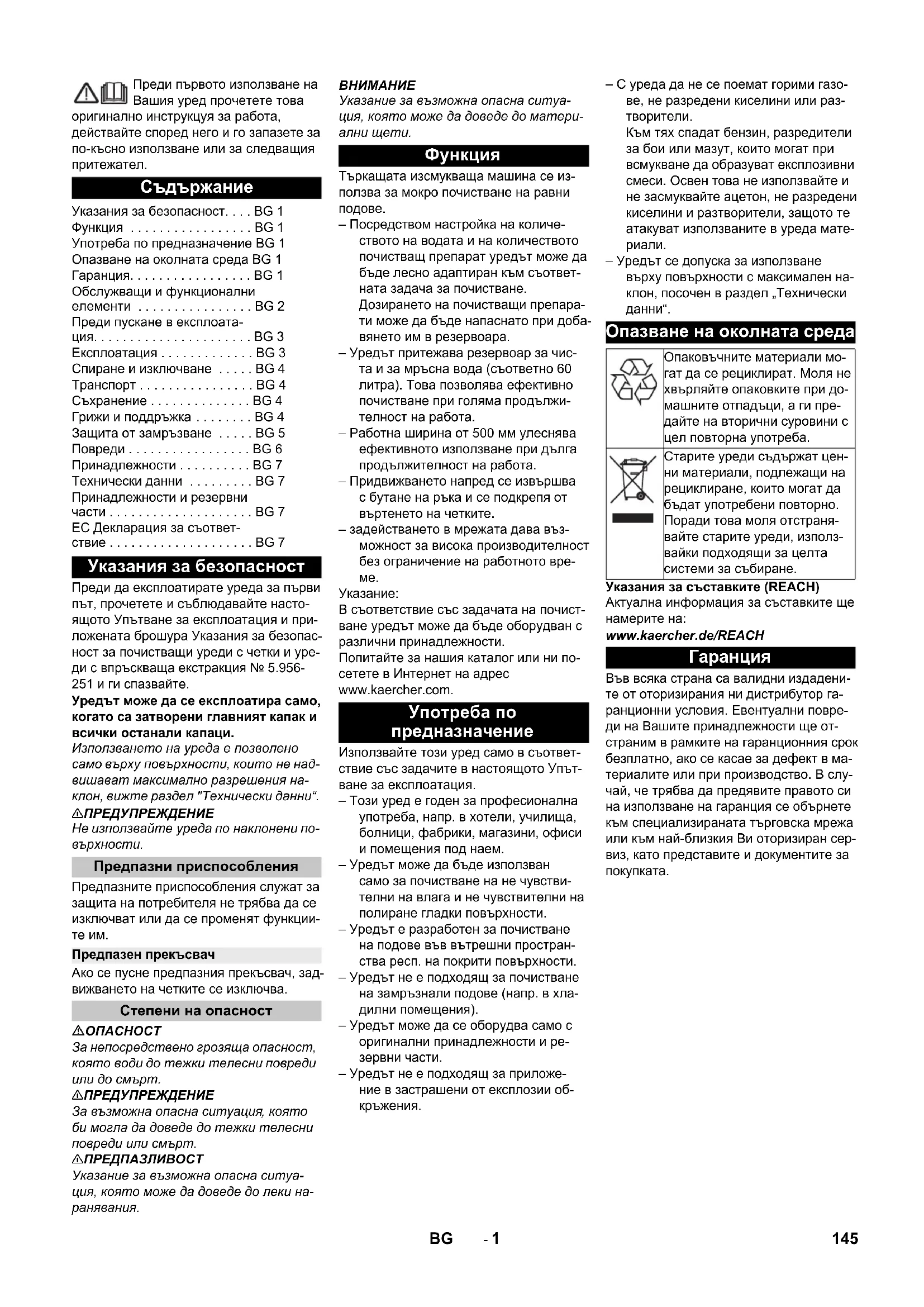 Chairman of the Board of Management Director Regulatory Affairs & Certification 144 SR- 1 Преди първото използване на Вашия уред прочетете това оригинално инструкцуя за работа, действайте според него и го запазете за по-късно използване или за следващия притежател. Преди да експлоатирате уреда за първи път, прочетете и съблюдавайте насто- ящото Упътване за експлоатация и при- ложената брошура Указания за безопас- ност за почистващи уреди с четки и уре- ди с впръскваща екстракция № 5.956- 251 и ги спазвайте. Уредът може да се експлоатира само, когато са затворени главният капак и всички останали капаци. Използването на уреда е позволено само върху повърхности, които не над- вишават максимално разрешения на- клон, вижте раздел "Технически данни“. 몇 ПРЕДУПРЕЖДЕНИЕ Не използвайте уреда по наклонени по-