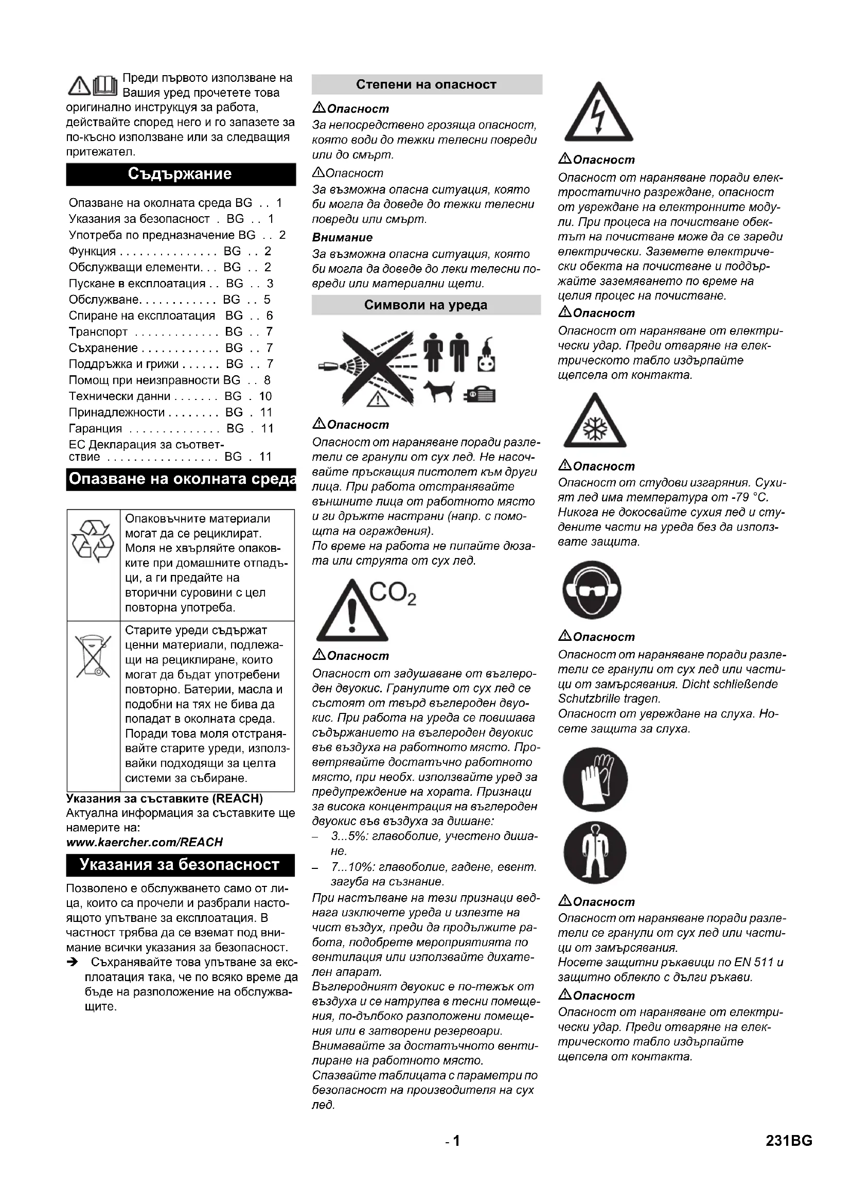 Опасност от нараняване поради разле- тели се предмети. Фиксирайте леки- те обекти на почистване, за да предотвратите увличане със струята от сух лед. 몇 Предупреждение Не използвайте уреда, ако в обсега се намират други лица, освен ако не но- сят защитно облекло. Не използвайте уреда, ако има повре- ден присъединителен кабел или важни части на уреда, напр. предпазни прис- пособления, маркучи за пръскащи сред- ства, пръскащи пистолети. Опасност от прищипване на приспосо- блението за дозиране. Преди отстра- няване на защитната ламарина в резервоара за сух лед непременно из- дърпайте щепсела на уреда от конта-