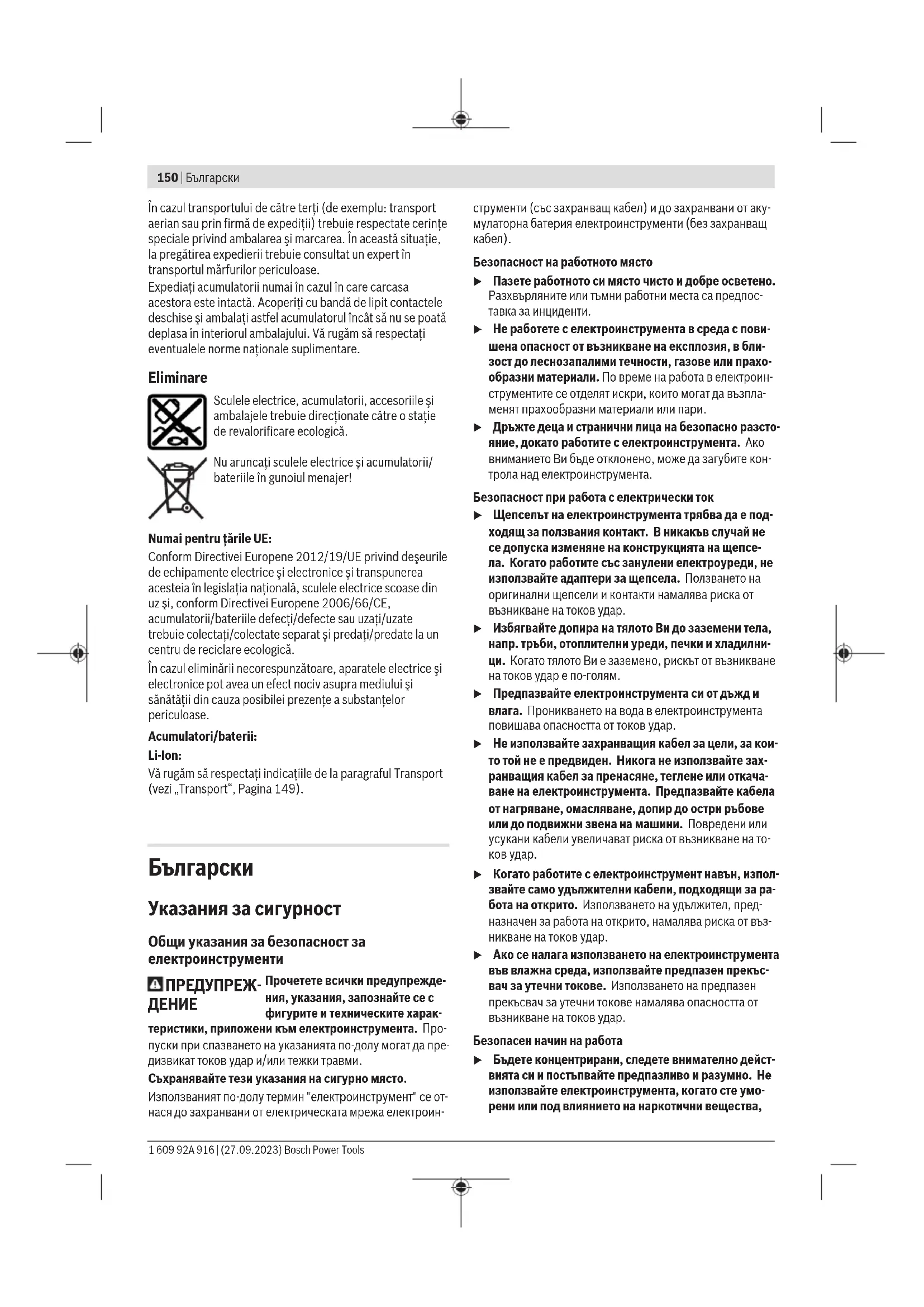 Електроинструментите, акумулаторните ба- терии и допълнителните приспособления трябва да бъдат предавани за оползотворя- ване на съдържащите се в тях суровини. Не изхвърляйте електроинструменти и аку- мулаторни или обикновени батерии при би- товите отпадъци! Само за страни отЕС: Съгласно европейска директива 2012/19/EС за старите електрически и електронни уреди и нейното транспорти- ране в националното право електроинструменти, които не могат да се ползват повече, а съгласно европейска ди- ректива 2006/66/EО повредени или изхабени обикнове- ни или акумулаторни батерии, трябва да се събират и предават за оползотворяване на съдържащите се в тях су-