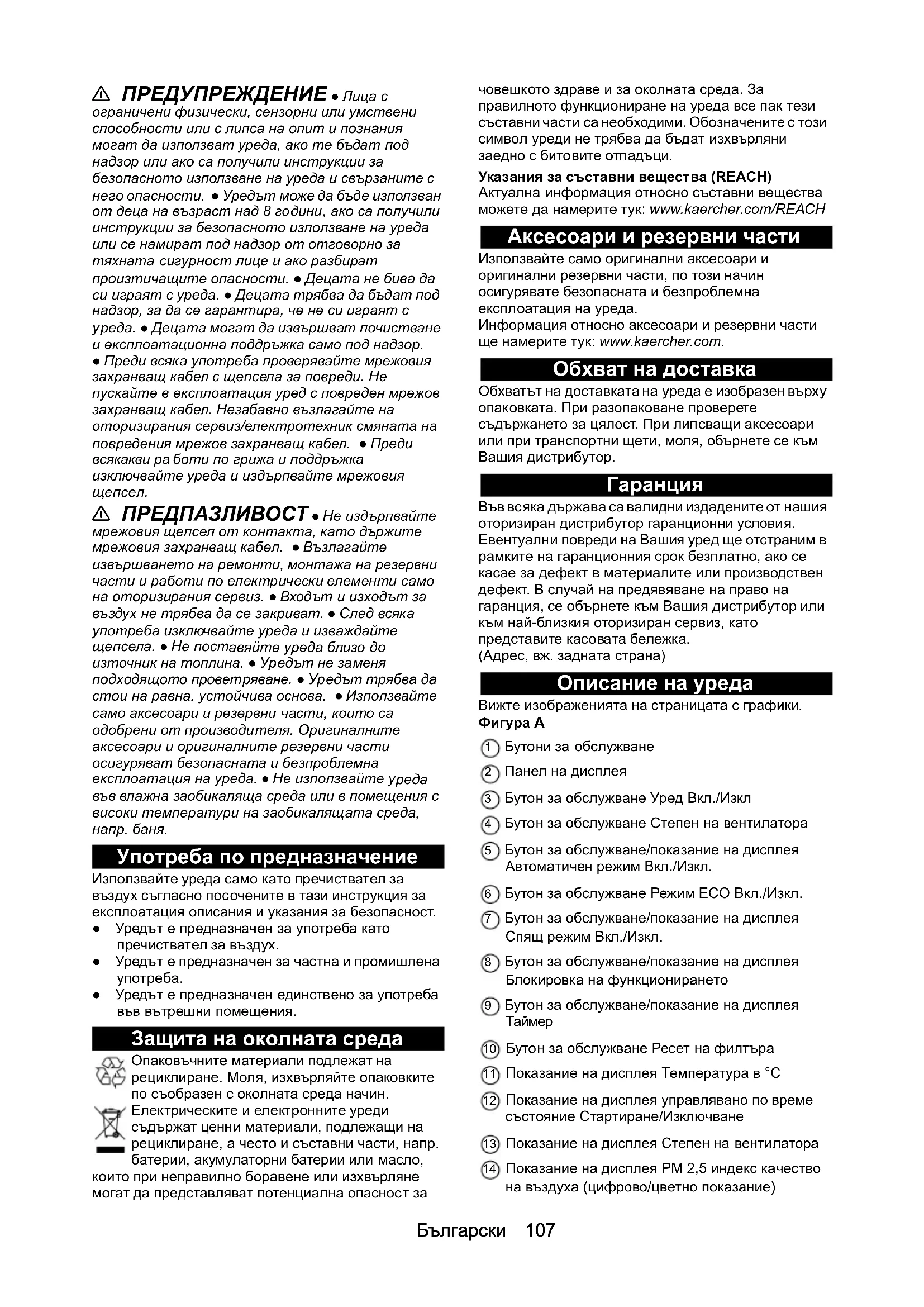 ●Уредът е предназначен единствено за употреба във вътрешни помещения. Защита на околната среда Опаковъчните материали подлежат на рециклиране. Моля, изхвърляйте опаковките по съобразен с околната среда начин. Електрическите и електронните уреди съдържат ценни материали, подлежащи на рециклиране, а често и съставни части, напр. батерии, акумулаторни батерии или масло, които при неправилно боравене или изхвърляне могат да представляват потенциална опасност за човешкото здраве и за околната среда. За правилното функциониране на уреда все пак тези съставни части са необходими. Обозначените с този символ уреди не трябва да бъдат изхвърляни заедно с битовите отпадъци. Указания за съставни вещества (REACH) Актуална информация относно съставни вещества можете да намерите тук: www.kaercher.com/REACH Аксесоари и резервни части Използвайте само оригинални аксесоари и оригинални резервни части, по този начин осигурявате безопасната и безпроблемна експлоатация на уреда. Информация относно аксесоари и резервни части ще намерите тук: www.kaercher.com. Обхват на доставка Обхватът на доставката на уреда е изобразен върху опаковката. При разопаковане проверете съдържането за цялост. При липсващи аксесоари или при транспортни щети, моля, обърнете се към Вашия дистрибутор.