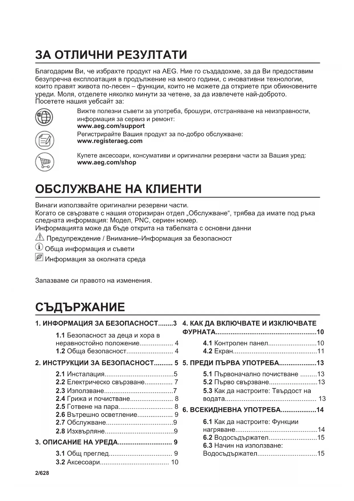 UKЗА ОТЛИЧНИ РЕЗУЛТАТИ Благодарим Ви, че избрахте продукт на AEG. Ние го създадохме, за да Ви предоставим безупречна експлоатация в продължение на много години, с иновативни технологии, които правят живота по-лесен – функции, които не можете да откриете при обикновените уреди. Моля, отделете няколко минути за четене, за да извлечете най-доброто. Посетете нашия уебсайт за: Вижте полезни съвети за употреба, брошури, отстраняване на неизправности, информация за сервиз и ремонт: www.aeg.com/support Регистрирайте Вашия продукт за по-добро обслужване: www.registeraeg.com Купете аксесоари, консумативи и оригинални резервни части за Вашия уред: www.aeg.com/shop ОБСЛУЖВАНЕ НА КЛИЕНТИ Винаги използвайте оригинални резервни части. Когато се свързвате с нашия оторизиран отдел „Обслужване“, трябва да имате под ръка следната информация: Модел, PNC, сериен номер. Информацията може да бъде открита на табелката с основни данни Предупреждение / Внимание–Информация за безопасност Обща информация и съвети Информация за околната среда Запазваме си правото на изменения.