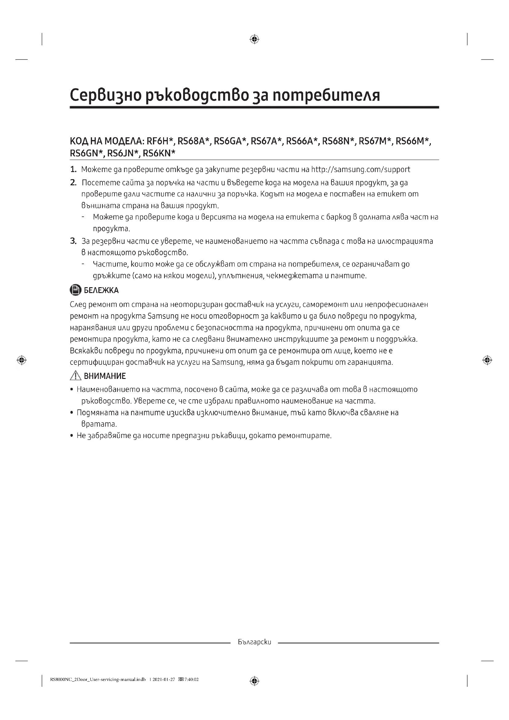 - Не забравяйте да носите предпазни ръкавици, докато ремонтирате. RS8000NC_2Door_User-servicing-manual.indb 1 2021-01-27 7:40:02Български Действителното изображение и предоставените части на хладилника могат да се различават, в зависимост от модела и страната.