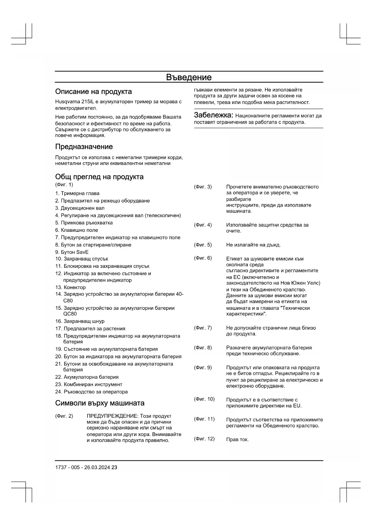 - Приложение 22 1737 - 005 - 26.03.2024Въведение Описание на продукта Husqvarna 215iL е акумулаторен тример за морава с електродвигател. Ние работим постоянно, за да подобряваме Вашата безопасност и ефективност по време на работа. Свържете се с дистрибутор по обслужването за повече информация. Предназначение Продуктът се използва с неметални тримерни корди, неметални струни или еквивалентни неметални гъвкави елементи за рязане. Не използвайте продукта за други задачи освен за косене на плевели, трева или подобна мека растителност. Забележка: Националните регламенти могат да поставят ограничения за работата с продукта. Общ преглед на продукта (Фиг. 1) p. 454
