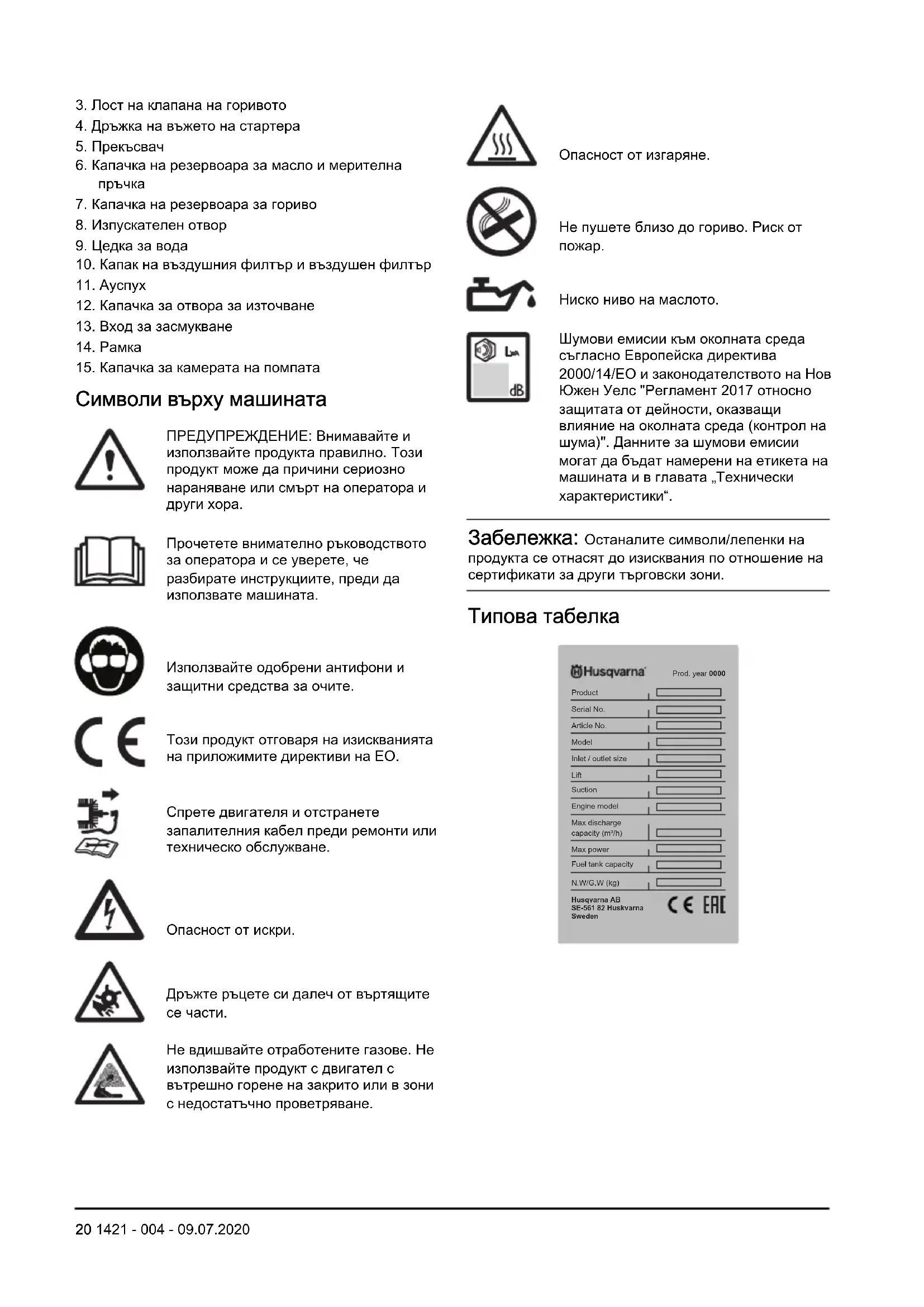 Ниско ниво на маслото. Шумови емисии към околната среда съгласно Европейска директива 2000/14/ЕО и законодателството на Нов Южен Уелс "Регламент 2017 относно защитата от дейности, оказващи влияние на околната среда (контрол на шума)". Данните за шумови емисии могат да бъдат намерени на етикета на машината и в главата „Технически характеристики“. Забележка: Останалите символи/лепенки на продукта се отнасят до изисквания по отношение на сертификати за други търговски зони. Типова табелка Prod. year 0000 Serial No. Product Article No. Model Inlet / outlet size Lift Suction Engine model Max power Fuel tank capacity N.W/G.W (kg) Max discharge capacity (m³/h) Husqvarna AB SE-561 82 Huskvarna Sweden 20 1421 - 004 - 09.07.2020Безопасност Дефиниции за безопасност Предупреждения, знаци за внимание и бележки се използват за указване на особено важни части на инструкцията. ПРЕДУПРЕЖДЕНИЕ: Използва се, ако има опасност от нараняване или смърт за оператора или за околните, ако не се спазват инструкциите в ръководството. ВНИМАНИЕ: Използва се, ако има опасност от повреждане на машината, други материали или съседната зона, ако не се спазват инструкциите в ръководството. Забележка: Използва се за предоставяне на повече информация, която е необходима в дадена