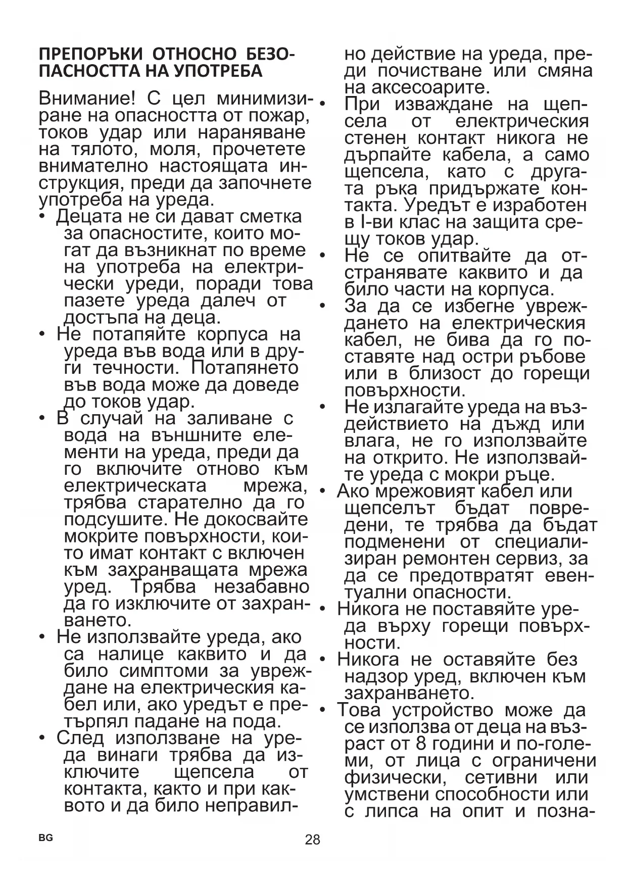 - Това устройство може да се използва от деца на въз- раст от 8 години и по-голе- ми, от лица с ограничени физически, сетивни или умствени способности или с липса на опит и позна- BG29 ния, ако те са под надзор или са били инструктира- ни, как да използват уре- да по безопасен начин и познават опасностите, свързани с използването на уреда. Децата не бива да си играят с уреда. По- чистването и поддръжката на уреда не бива да се из- вършва от деца освен, ако са навършили 8 години и са под надзор на съответ- но лице. Повърхността, върху която се използва уредът по време на рабо- та, трябва да бъде ниве- лирана, чиста и суха.