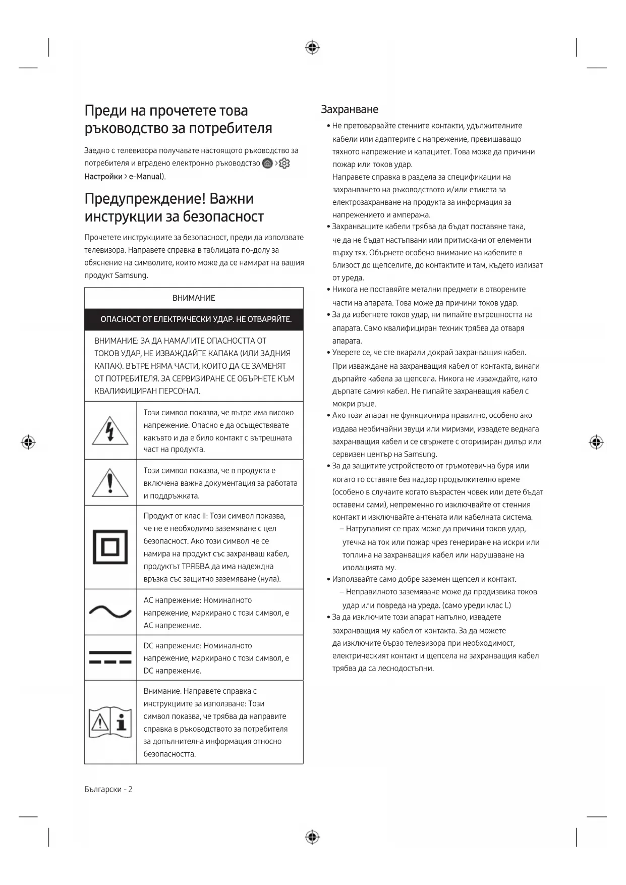 Настройки > e-Manual). Предупреждение! Важни инструкции за безопасност Прочетете инструкциите за безопасност, преди да използвате телевизора. Направете справка в таблицата по-долу за обяснение на символите, които може да се намират на вашия продукт Samsung.