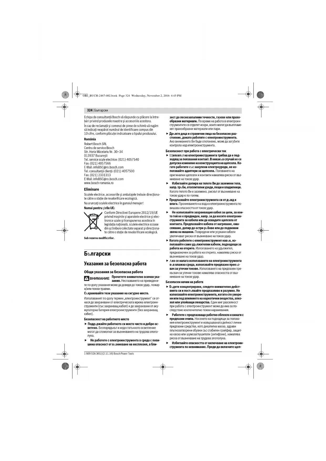 OBJ_BUCH-2487-002.book Page 333 Wednesday, November 2, 2016 4:43 PM334 | Български 1 609 92A 36G | (2.11.16) Bosch Power Tools Посоченото в това ръководство за експлоатация равнище на генерираните вибрации е измерено съгласно процеду- ра, стандартизирана в EN 60745, и може да служи за срав- няване на електроинструменти един с друг. То е подходя- що също и за предварителна ориентировъчна преценка на натоварването от вибрации. Посоченото ниво на генерираните вибрации е представи- телно за най-често срещаните приложения на електроин- струмента. Ако обаче електроинструментът бъде използ- ван за други дейности, с различни работни инструменти или без необходимото техническо обслужване, нивото на вибрациите може да се различава. Това би могло да увели- чи значително сумарното натоварване от вибрации в про- цеса на работа. За точната преценка на натоварването от вибрации трябва да бъдат взимани предвид и периодите, в които електро- инструментът е изключен или работи, но не се ползва. То- ва би могло значително да нам али сумарното натоварване от вибрации. Предписвайте допълнителни мерки за предпазване на ра- ботещия с електроинструмента от въздействието на ви- брациите, например: техническо обслужване на електроинструмента и работните инструменти, поддържа- не на ръцете топли, целесъобразна организация на работ- ните стъпки. Декларация за съответствие С пълна отговорност ние декларираме, че описаният в раздела „Технически данни“ съответства на всички валид- ни изисквания на директивите 2011/65/EС, 2014/30/EС, 2006/42/EО, включително на измененията им и покрива изискванията на стандартите: EN 60745-1, EN 60745-2-3, EN50581. Техническа документация (2006/42/ЕО) при: Robert Bosch Power Tools GmbH, PT/ECS, 70538 Stuttgart, GERMANY Robert Bosch Power Tools GmbH 70538 Stuttgart, GERMANY Stuttgart, 01.01.2017