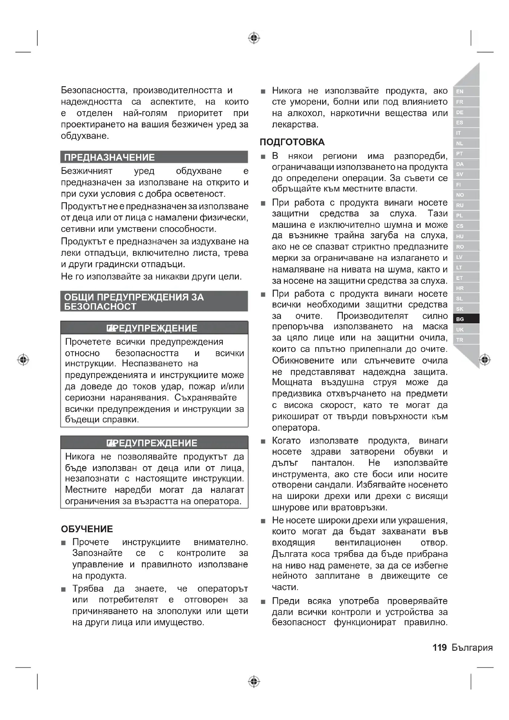 ПРЕДНАЗНАЧЕНИЕ Безжичният уред обдухване е предназначен за използване на открито и при сухи условия с добра осветеност. Продуктът не е предназначен за използване от деца или от лица с намалени физически, сетивни или умствени способности. Продуктът е предназначен за издухване на леки отпадъци, включително листа, трева и други градински отпадъци. Не го използвайте за никакви други цели. ОБЩИ ПРЕДУПРЕЖДЕНИЯ ЗА БЕЗОПАСНОСТ ПРЕДУПРЕЖДЕНИЕ Прочетете всички предупреждения относно безопасността и всички инструкции. Неспазването на предупрежденията и инструкциите може да доведе до токов удар, пожар и/или сериозни наранявания. Съхранявайте всички предупреждения и инструкции за бъдещи справки. ПРЕДУПРЕЖДЕНИЕ Никога не позволявайте продуктът да бъде използван от деца или от лица, незапознати с настоящите инструкции. Местните наредби могат да налагат ограничения за възрастта на оператора.