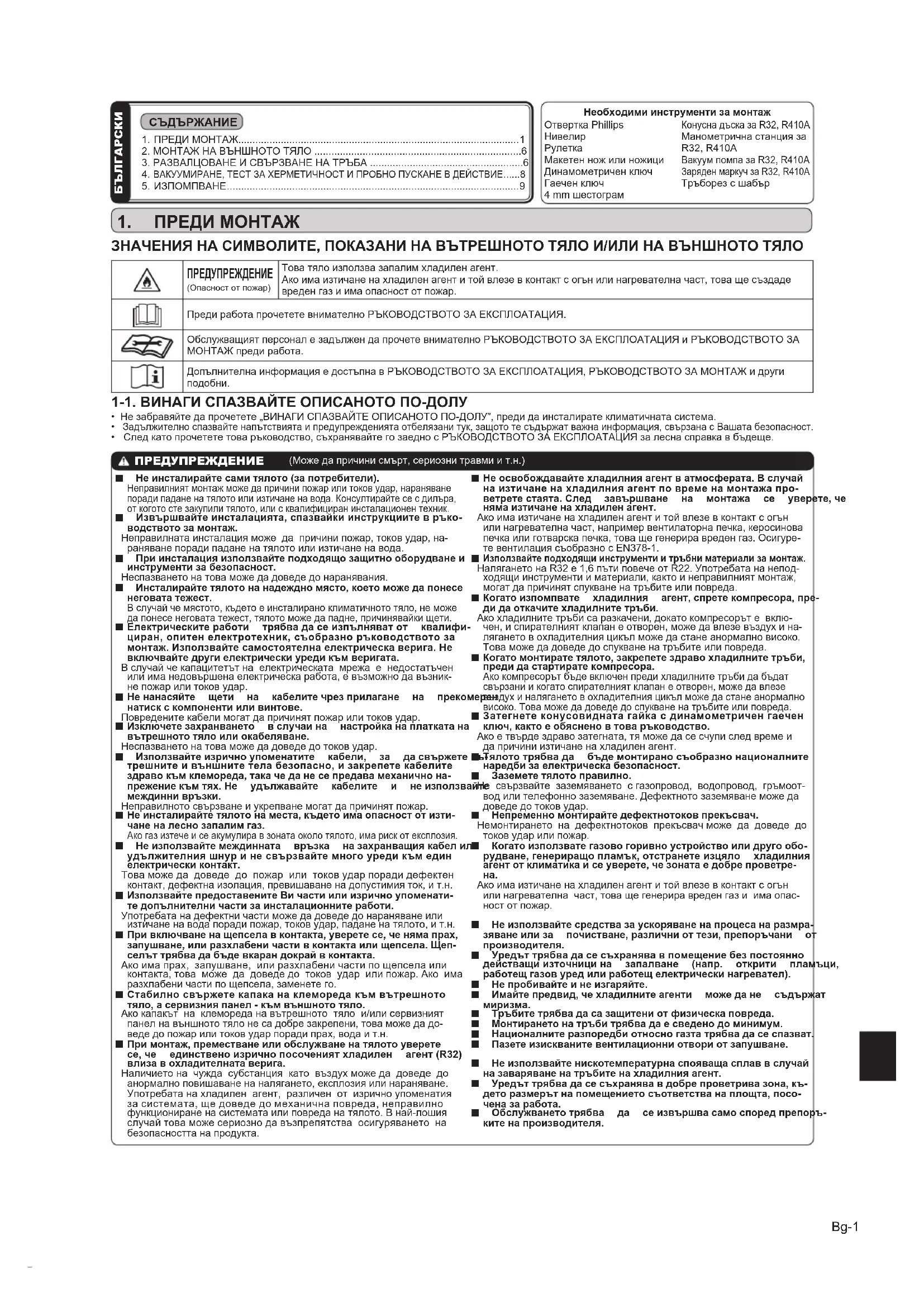 Използвайтеподходящиинструментиитръбниматериализамонтаж. Налягането на R32 е 1,6 пъти повече от R22. Употребата на непод- ходящи инструменти и материали, както и неправилният монтаж, могат да причинят спукване на тръбите или повреда.