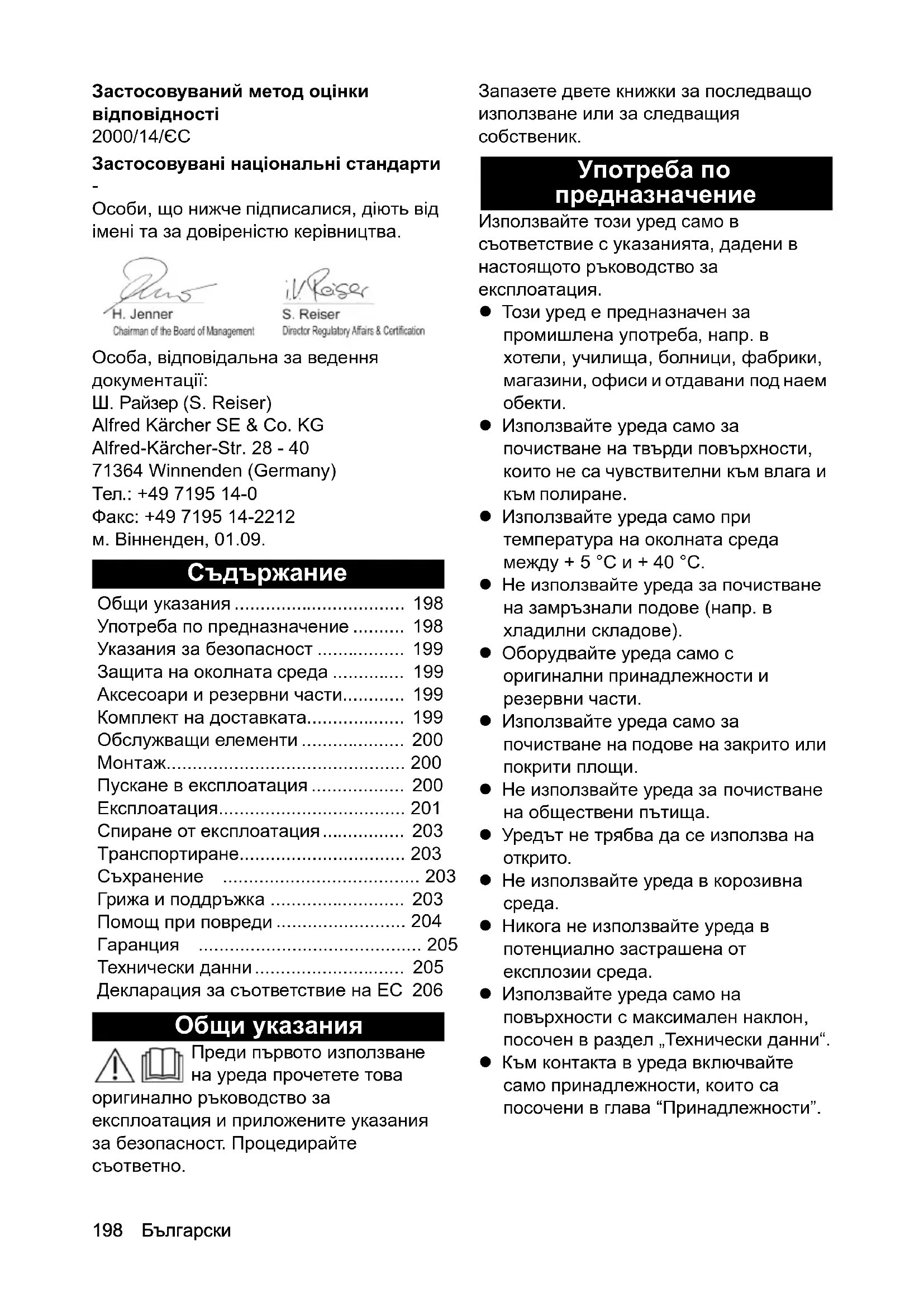 Гаранция ........................................... 205 Технически данни............................. 205 Декларация за съответствие на ЕС 206Български 199 Указания за безопасност Преди първото пускане на уреда в експлоатация прочетете и съблюдавайте настоящото ръководство за експлоатация и приложената брошура „Указания за безопасност на еднодискови машини за почистване“ № 5.956-659.0, и действайте съобразно