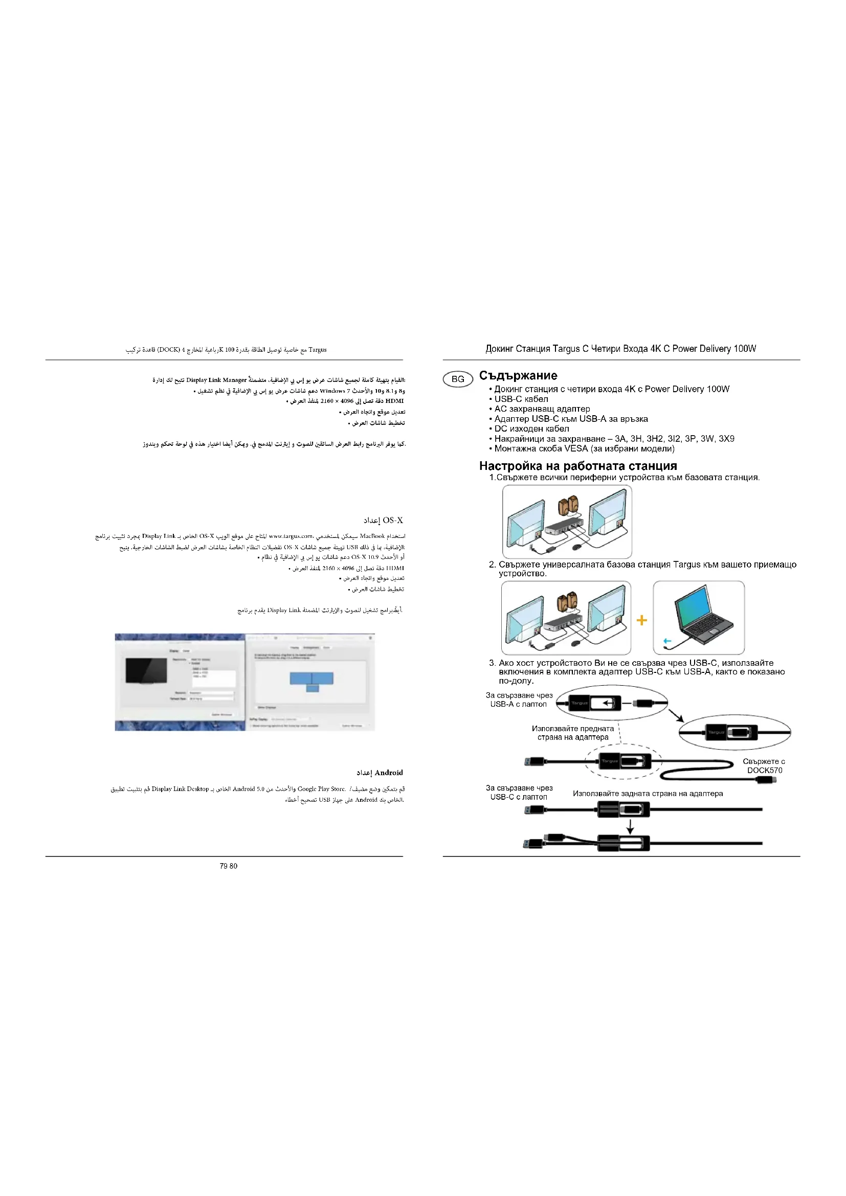 С цел оптимална работа в Windows актуализирайте приемащия адаптер за монитора на компютъра и USB 3.0 драйверите. Тези актуализации често се осъществяват от ИТ отдела във вашата компания или се предоставят от производителя на компютъра ви, ако имате администраторски права за сваляне и инсталиране на драйвери на компютъра си. Добре дошли в Display Link модула за управление на вашата универсална базова станция Targus. Ако не е инсталиран предварително, софтуерът за DisplayLink модула може да се свали от сървъра Windows Update или от www.targus.com. Можете да го откриете като икона в областта със задачите в Windows (Task Tray), като с него лесно можете да свързвате допълнителни монитори към своя преносим компютър или основен екран чрез базовата станция Targus. От меню „Разделителна способност на екрана“ в Контролния панел в Windows можете да конфигурирате свързаните монитори, така че или да отразяват основния ви екран, или да разширят екрана ви при работа в Windows, така че да виждате повече приложения наведнъж. Устройствата Display Link USB Graphics също могат да се конфигурират и да функционират като основен екран. Докинг Станция Targus С Четири Входа 4K С Power Delivery 100W Gigabit EthernetHDMIDP++ USB 3.1 (5Gbps)USB 3.1 (5Gbps) порт (поддържа зареждане) USB-C (10 Gps, само данни)Слот за заключванеАудио конектор за слушалкиUSB към порт на преносимия компютърИзход за захранване с постоянен токВход за захранване с постоянен токВКЛ. / ИЗКЛ. на захранването83 84folding line2 staples here (saddle stitching)folding line2 staples here (saddle stitching)Open size: 10”W x7”H Folded Size: 5”W x 7”H Material: 80gsm woodfree paper Color: GrayscaleDiecut Настройка за OS-X Настройка за Android При инсталацията на софтуера от Display Link при OS-X, който е наличен на www.targus.com, потребителите на MacBook могат да настроят външните монитори от „Екрани“ (Displays) в „Системни предпочитания“ (System Preferences). OS-X позволява конфигуриране на допълнителни USB екрани, включително:• Поддръжка за допълнителни USB екрани в OS-X 10.9 или по-нова• Разделителна способност до 4096 x 2160 за DisplayPort или HDMI• Промяна на ориентацията и местоположението на екрана• Подредба на екранаСофтуерът Display Link предоставя и вградени драйвери за звук и Ethernet. Инсталирайте приложението Display Link Desktop за Android 5.0 или по-нова от Google Play Магазин. Включете USB режим „Отстраняване на грешки“ или „Хост режим“ (Debugging/Host mode) на вашето устройство с Android.Модулът за управление Display Link дава възможност за пълна конфигурация на всички допълнителни USB екрани, в това число:• Поддръжка на допълнителни USB екрани в Windows 7, 8, 8.1, 10 и по-нова• Разделителна способност до 4096 x 2160 за DisplayPort или HDMI• Промяна на ориентацията и местоположението на екрана• Подредба на екранаСофтуерът Display Link предоставя и вградени драйвери за звук и Ethernet. Те могат да бъдат избрани и в контролния панел в Windows. Sadržaj