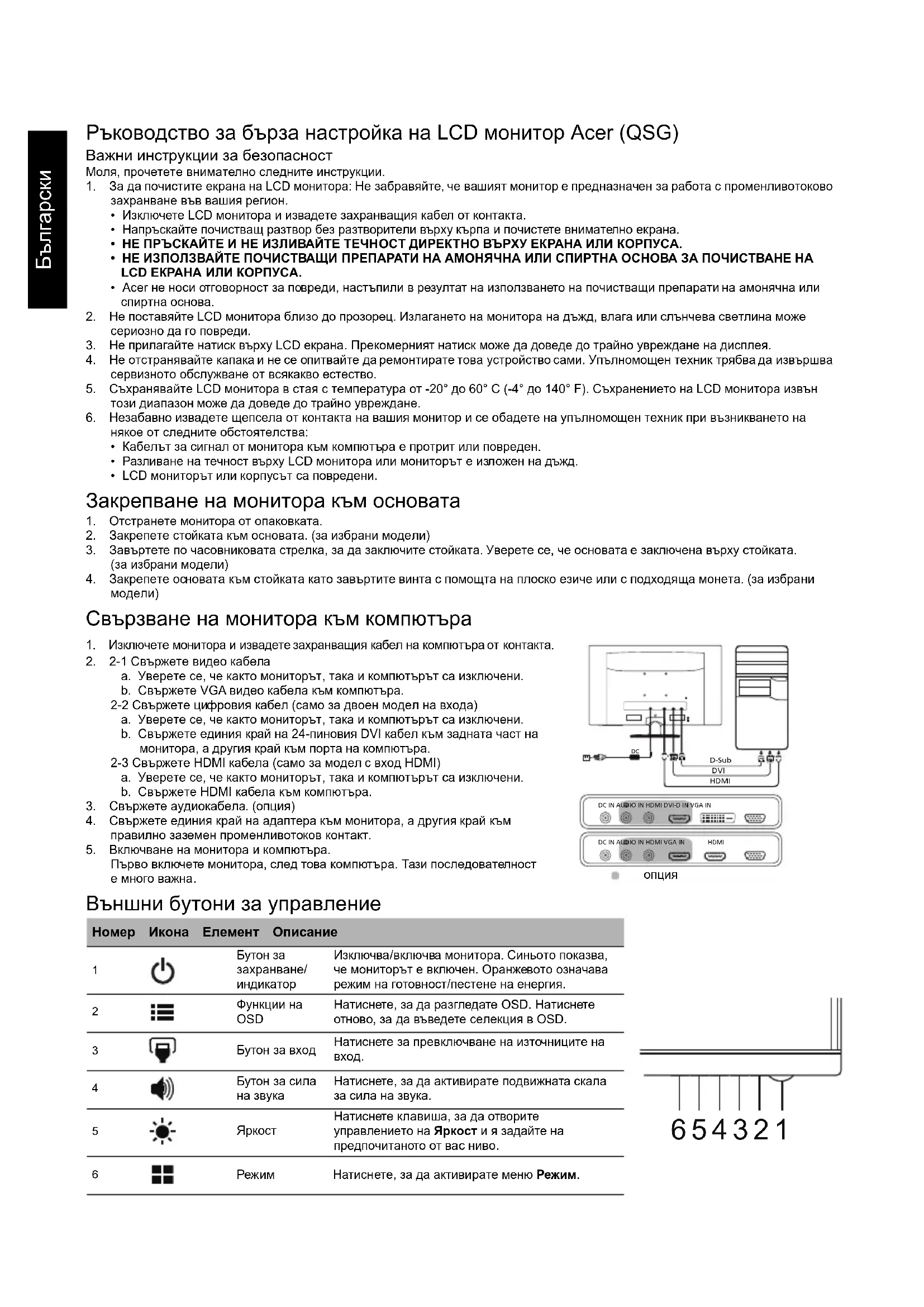 654321Български Разпоредби и бележки за безопасност Бележка от Федералната комисия за комуникации (ФКК) Това устройство е тествано и отговаря на ограниченията за цифрово устройство от клас B, съгласно част 15 от правилата на ФКК. Тези ограничения са предназначени да осигуряват разумна защита срещу вредни смущения в жилищни инсталации. Това устройство генерира, използва и може да излъчва радиочестотна енергия и ако не бъде монтирано и използвано, в съответствие с инструкциите, може да причини вредни смущения на радио комуникациите. Въпреки това, няма гаранции, че няма да възникнат смущения в конкретна инсталация. Ако устройството причинява вредни смущения на радио и телевизионно приемане, което може да се установи чрез изключване и включване на устройството, потребителят се насърчава да се опита да коригира смущението чрез една от следните мерки: Преориентиране или преместване на антената на приемника. Увеличаване на разстоянието между устройството и приемника. Свързване на устройството в контакт във верига, която е различна от тази, в която е свързан приемникът. Консултация с доставчик или опитен радио/телевизионен техник за помощ. CE декларация за съответствие С настоящето, Acer Inc., декларира, че този LCD монитор е в съответствие със съществените изисквания и други приложими разпоредби на директивата за електромагнитна съвместимост (EMC) 2014/30/ЕC, директивата за ниско напрежение 2014/35/ЕC и RoHS директивата 2011/65/ЕC, и директива 2009/125/EО по отношение на създаването на рамка за определяне на изискванията за екодизайн за продукти, свързани с енергопотребление.