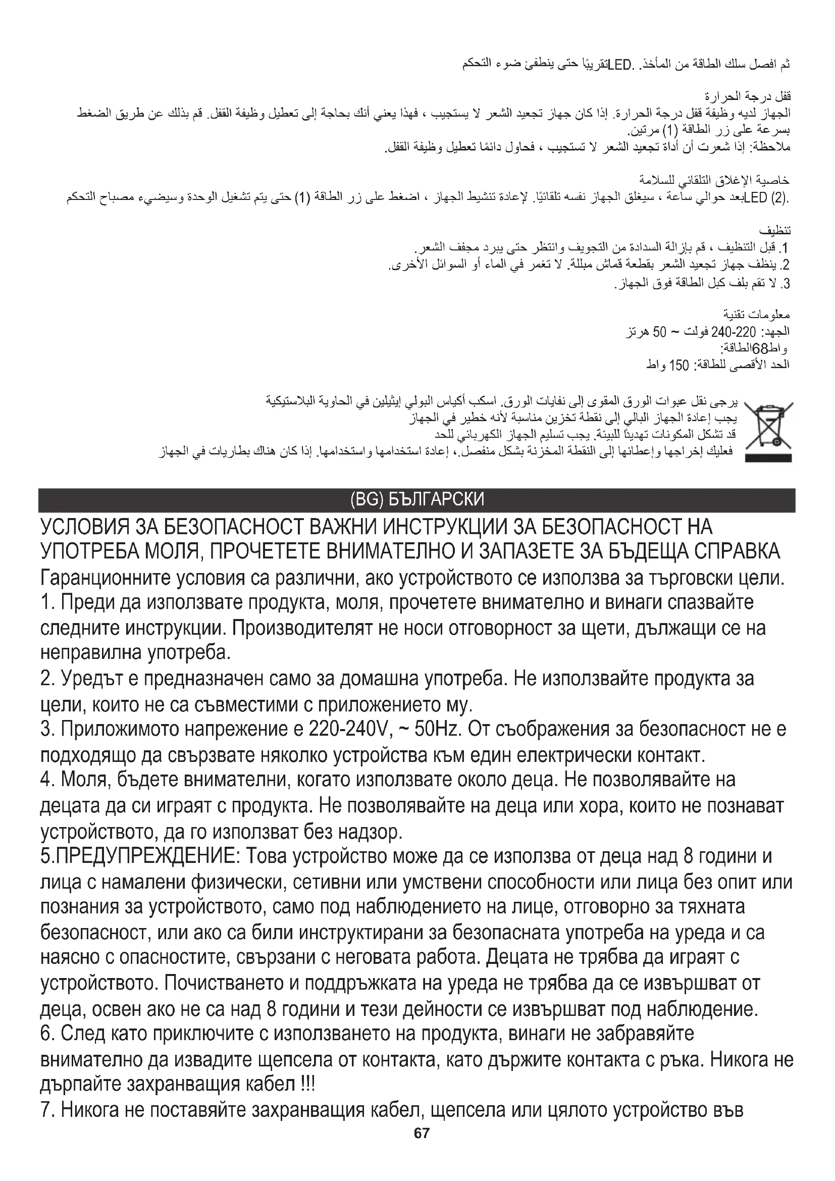 5.ПРЕДУПРЕЖДЕНИЕ: Това устройство може да се използва от деца над 8 години и лица с намалени физически, сетивни или умствени способности или лица без опит или познания за устройството, само под наблюдението на лице, отговорно за тяхната безопасност, или ако са били инструктирани за безопасната употреба на уреда и са наясно с опасностите, свързани с неговата работа. Децата не трябва да играят с устройството. Почистването и поддръжката на уреда не трябва да се извършват от деца, освен ако не са над 8 години и тези дейности се извършват под наблюдение.