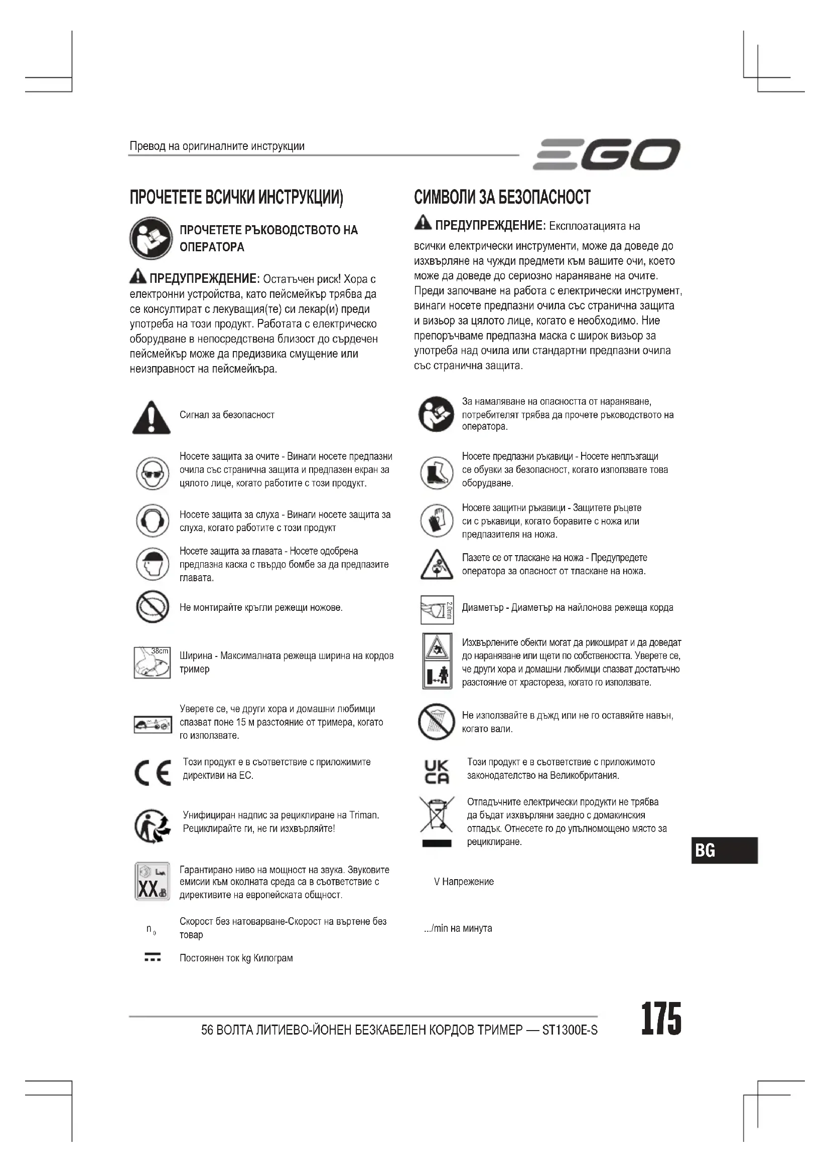 ГАРАНЦИОННА ПОЛИТИКА EGO Моля посетете уебсайта egopowerplus.com за пълните условия по гаранционната политика на EGO.BEŽIČNI ŠIŠAČ SA ŽINJOM OD 56 VOLTI — ST1300E-S182