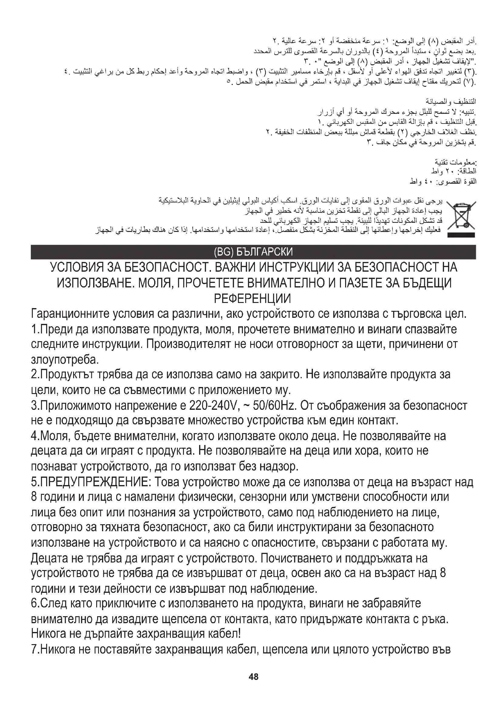 Гаранционните условия са различни, ако устройството се използва с търговска цел. 1.Преди да използвате продукта, моля, прочетете внимателно и винаги спазвайте следните инструкции. Производителят не носи отговорност за щети, причинени от злоупотреба. 2.Продуктът трябва да се използва само на закрито. Не използвайте продукта за цели, които не са съвместими с приложението му. 3.Приложимото напрежение е 220-240V, ~ 50/60Hz. От съображения за безопасност не е подходящо да свързвате множество устройства към един контакт. 4.Моля, бъдете внимателни, когато използвате около деца. Не позволявайте на децата да си играят с продукта. Не позволявайте на деца или хора, които не познават устройството, да го използват без надзор. 5.ПРЕДУПРЕЖДЕНИЕ: Това устройство може да се използва от деца на възраст над 8 години и лица с намалени физически, сензорни или умствени способности или лица без опит или познания за устройството, само под наблюдението на лице, отговорно за тяхната безопасност, ако са били инструктирани за безопасното използване на устройството и са наясно с опасностите, свързани с работата му. Децата не трябва да играят с устройството. Почистването и поддръжката на устройството не трябва да се извършват от деца, освен ако са на възраст над 8 години и тези дейности се извършват под наблюдение. 6.След като приключите с използването на продукта, винаги не забравяйте внимателно да извадите щепсела от контакта, като придържате контакта с ръка. Никога не дърпайте захранващия кабел! 7.Никога не поставяйте захранващия кабел, щепсела или цялото устройство във ٢. ﺔﯾﻟﺎﻋ ﺔﻋرﺳ :٢ وأ ﺔﺿﻔﺧﻧﻣ ﺔﻋرﺳ :١ :ﻊﺿوﻟا ﻰﻟإ (٨) ضﺑﻘﻣﻟا ردأ. ددﺣﻣﻟا سرﺗﻠﻟ ىوﺻﻘﻟا ﺔﻋرﺳﻟﺎﺑ نارودﻟﺎﺑ (٤) ﺔﺣورﻣﻟا أدﺑﺗﺳ ، ناوﺛ ﻊﺿﺑ دﻌﺑ.