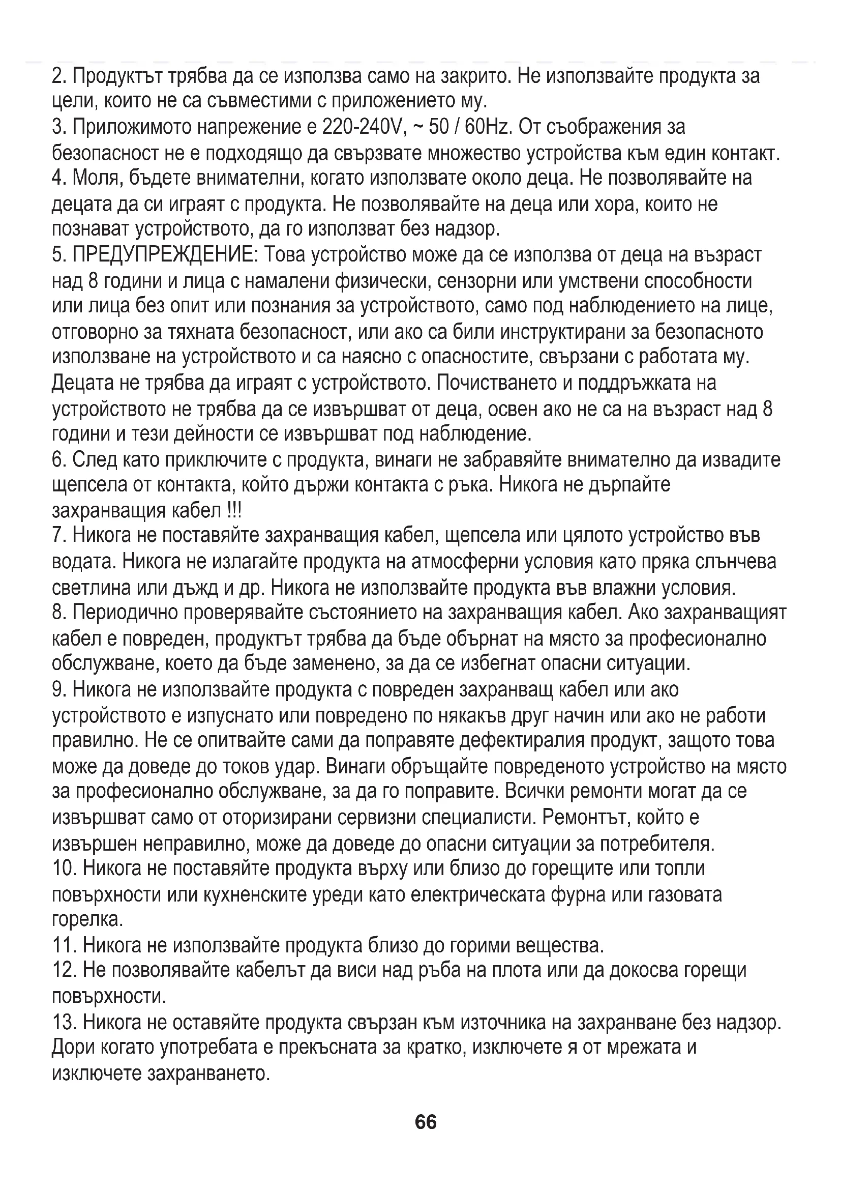 спазвайте следните инструкции. Производителят не носи отговорност за щети, причинени от злоупотреба. УСЛОВИЯ ЗА БЕЗОПАСНОСТ ВАЖНИ ИНСТРУКЦИИ ЗА БЕЗОПАСНОСТ НА ИЗПОЛЗВАНЕ, МОЛЯ, ПРОЧЕТЕТЕ ВНИМАТЕЛНО И ПАЗЕТЕ ЗА БЪДЕЩА РЕФЕРЕНЦИЯ66