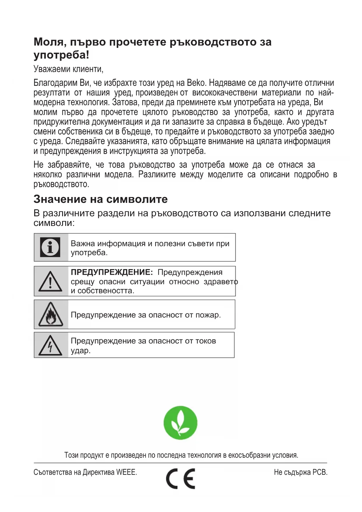 Уважаеми клиенти, Благодарим Ви, че избрахте този уред на Beko. Надяваме се да получите отлични резултати от нашия уред, произведен от висококачествени материали по най- модерна технология. Затова, преди да преминете към употребата на уреда, Ви молим първо да прочетете цялото ръководство за употреба, както и другата придружителна документация и да ги запазите за справка в бъдеще. Ако уредът смени собственика си в бъдеще, то предайте и ръководството за употреба заедно с уреда. Следвайте указанията, като обръщате внимание на цялата информация и предупреждения в инструкцията за употреба. Не забравяйте, че това ръководство за употреба може да се отнася за няколко различни модела. Разликите между моделите са описани подробно в ръководството. Значение на символите В различните раздели на ръководството са използвани следните