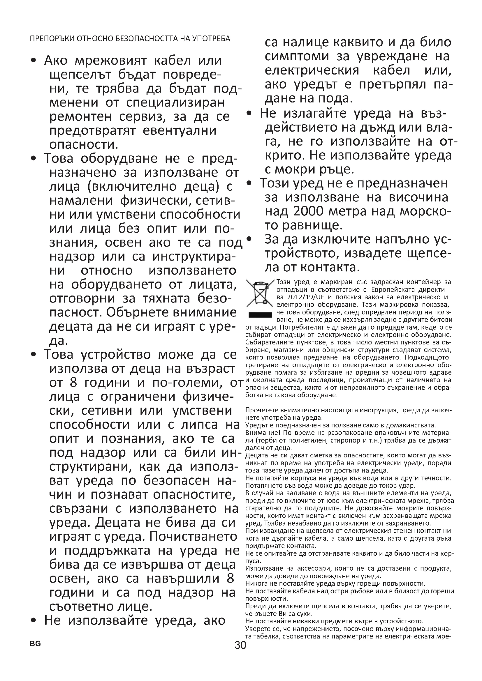 - За да изключите напълно ус- тройството, извадете щепсе- ла от контакта. Този уред е маркиран със задраскан контейнер за отпадъци в съответствие с Европейската директи- ва 2012/19/UE и полския закон за електрическо и електронно оборудване. Тази маркировка показва, че това оборудване, след определен период на полз- ване, не може да се изхвърля заедно с другите битови отпадъци. Потребителят е длъжен да го предаде там, където се събират отпадъци от електрическо и електронно оборудване. Събирателните пунктове, в това число местни пунктове за съ- биране, магазини или общински структури създават система, която позволява предаване на оборудването. Подходящото третиране на отпадъците от електрическо и електронно обо- рудване помага за избягване на вредни за човешкото здраве и околната среда последици, произтичащи от наличието на опасни вещества, както и от неправилното съхранение и обра- ботка на такова оборудване. Прочетете внимателно настоящата инструкция, преди да започ- нете употреба на уреда. Уредът е предназначен за ползване само в домакинствата. Внимание! По време на разопаковане опаковъчните материа- ли (торби от полиетилен, стиропор и т.н.) трябва да се държат далеч от деца. Децата не си дават сметка за опасностите, които могат да въз- никнат по време на употреба на електрически уреди, поради това пазете уреда далеч от достъпа на деца. Не потапяйте корпуса на уреда във вода или в други течности. Потапянето във вода може да доведе до токов удар. В случай на заливане с вода на външните елементи на уреда, преди да го включите отново към електрическата мрежа, трябва старателно да го подсушите. Не докосвайте мокрите повърх- ности, които имат контакт с включен към захранващата мрежа уред. Трябва незабавно да го изключите от захранването. При изваждане на щепсела от електрическия стенен контакт ни- кога не дърпайте кабела, а само щепсела, като с другата ръка придържате контакта. Не се опитвайте да отстранявате каквито и да било части на кор-