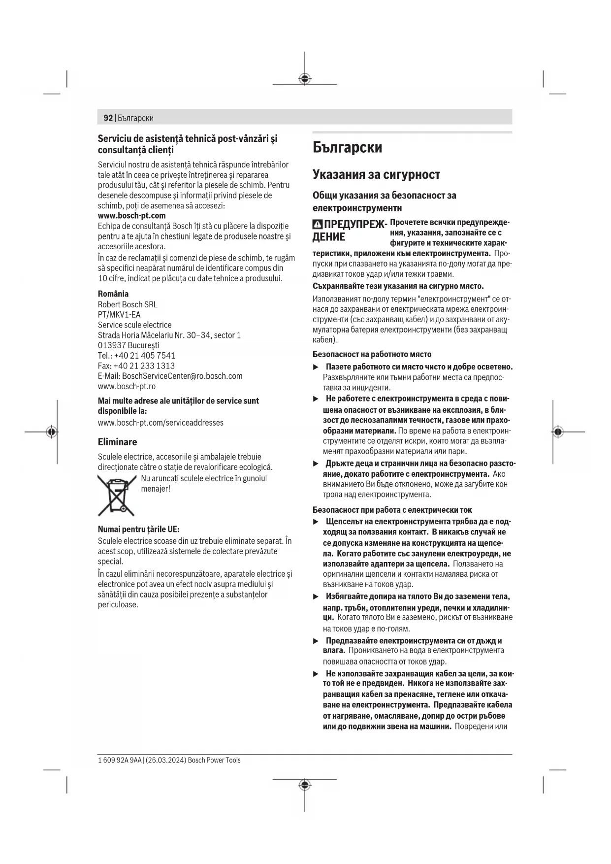 u Преди да извършвате каквито и да е дейности по електроинструмента, напр. настройване, смяна на работен инструмент, както и когато го прибирате, изключвайте щепсела от контакта, респ. изваждай- те батерията, ако е възможно. Тази мярка премахва опасността от задействане на електроинструмента по невнимание. u Съхранявайте електроинструментите на места, къ- дето не могат да бъдат достигнати от деца. Не до- пускайте те да бъдат използвани от лица, които не са запознати с начина на работа с тях и не са проче- ли тези инструкции. Когато са в ръцете на неопитни потребители, електроинструментите могат да бъдат из- ключително опасни. u Поддържайте добре електроинструментите си и ак- сесоарите им. Проверявайте дали подвижните зве- на функционират безукорно, дали не заклинват, да- ли има счупени или повредени детайли, които нару- шават или изменят функциите на електроинстру- мента. Преди да използвате електроинструмента, се погрижете повредените детайли да бъдат ремон- тирани. Много от трудовите злополуки се дължат на недобре поддържани електроинструменти и уреди. u Поддържайте режещите инструменти винаги добре заточени и чисти. Добре поддържаните режещи инст- рументи с остри ръбове оказват по‑малко съпротивле- ние и се водят по‑леко. u Използвайте електроинструментите, допълнител- ните приспособления, работните инструменти и т. н., съобразно инструкциите на производителя. При това се съобразявайте и с конкретните работни ус- ловия и операции, които трябва да изпълните. Из- ползването на електроинструменти за различни от предвидените от производителя приложения повиша- ва опасността от възникване на трудови злополуки. Bosch Power Tools 1 609 92A 9AA | (26.03.2024)94 | Български u Поддържайте дръжките и ръкохватките сухи, чисти и неомаслени. Хлъзгавите дръжки и ръкохватки не позволяват безопасната работа и доброто контролира- не на електроинструмента при възникване на неочак- вана ситуация.