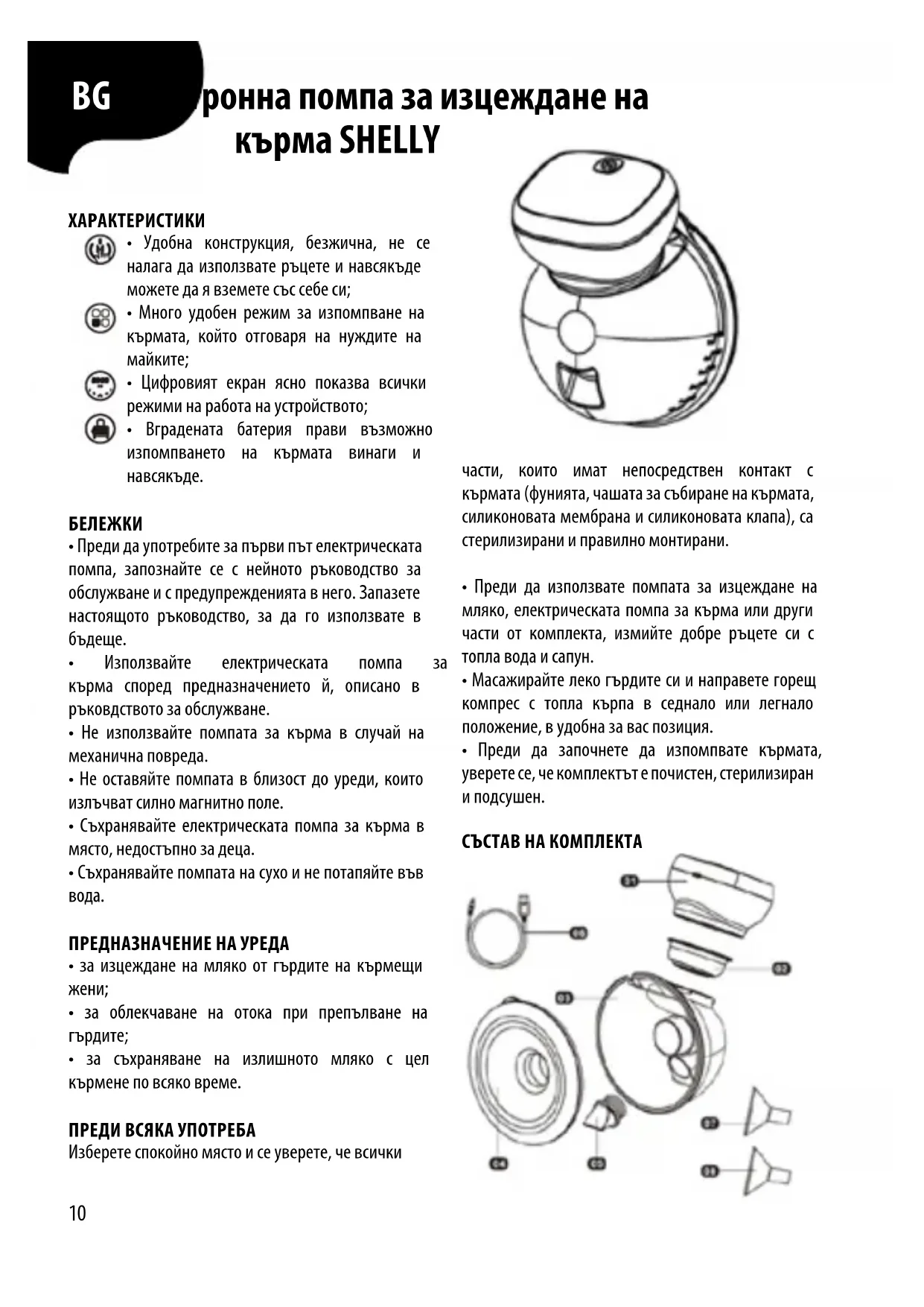 - за съхраняване на излишното мляко с цел кърмене по всяко време. ПРЕДИ ВСЯКА УПОТРЕБА Изберете спокойно място и се уверете, че всички BG Електронна помпа за изцеждане на кърма SHELLY части, които имат непосредствен контакт с кърмата (фунията, чашата за събиране на кърмата, силиконовата мембрана и силиконовата клапа), са стерилизирани и правилно монтирани.