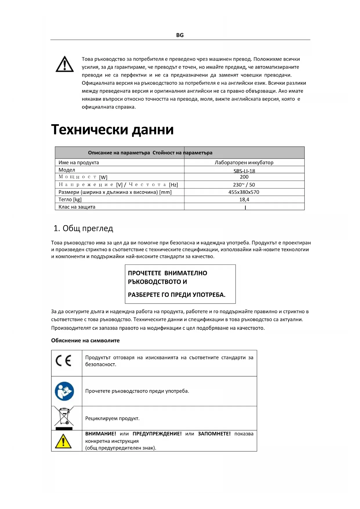 на възрастен. j) Никога не се опитвайте да бъркате в уреда, за да промените неговите параметри или структура. k) Дръжте уреда далеч от източници на огън и топлина. l) Не покривайте вентилационните отвори на уреда! m) Не използвайте запалими или експлозивни органични разтворители, докато работите с уреда. n) Не поставяйте никакви летливи вещества вътре в работещия уред. o) Не прилагайте механичен натиск върху уреда и не го излагайте на удар или падане. p) Не дръжте никакви предмети върху уреда. q) Не местете уреда с мостри вътре в него. Ако уредът трябва да бъде преместен, първо го изключете от захранването и използвайте двете си ръце, за да преместите инкубатора, като го държите хоризонтално.BG r) Ако някоя функция не успее, незабавно спрете процеса на инкубация. Неправилните работни условия могат да доведат до вредно действие на съдържанието на пробата. ВНИМАНИЕ! Въпреки че уредът е проектиран да бъде безопасен и е снабден с адекватни предпазни мерки и въпреки използването на допълнителни мерки за безопасност, все още има нисък, остатъчен риск от злополука или нараняване по време на неговата работа. Препоръчва се повишено внимание и здрав разум при използване на
