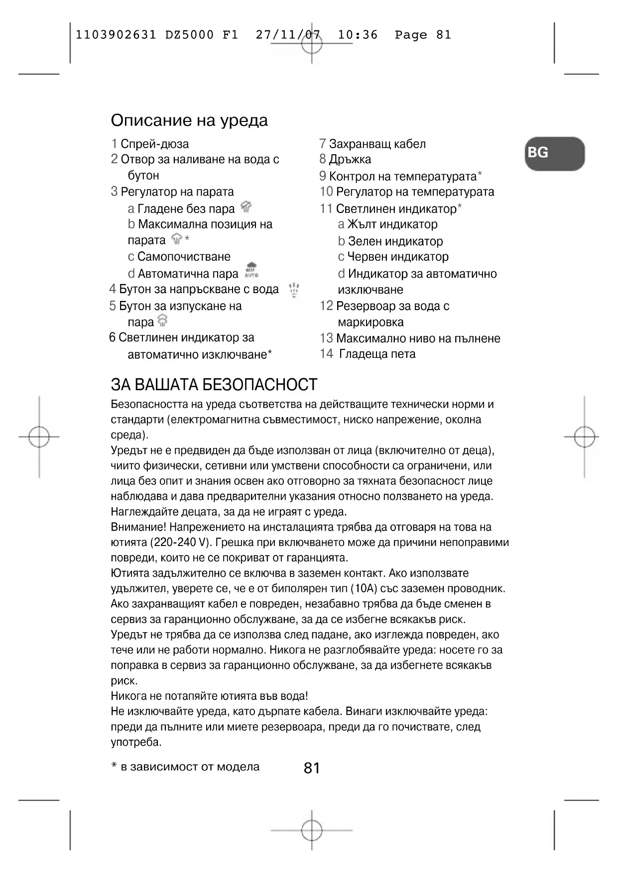 1103902631 DZ5000 F1 27/11/07 10:36 Page 81Никога не оставяйте уреда без надзор, когато е включен в електрическата мрежа, и докато не е изстинал – около 1 час след употреба. Гладещата повърхност е гореща: никога не я докосвайте с ръка ; винаги изчаквайте ютията да се охлади, преди да я приберете. Уредът изпуска пара, която може да причини изгаряния, най-вече когато гладите в ъгъла на дъската за гладене. Никога не насочвайте парата към хора или животни. Вашата ютия трябва да се използва и поставя върху стабилна повърхност. Когато слагате ютията на поставката й, уверете се, че повърхността, на която стои е стабилна. Този продукт е създаден единствено за домашна употреба. Фирмата – производител не поема никаква отговорност и гаранцията се обезсилва при неподходяща употреба или такава, противоречаща на указанията. Защита на околна среда! Вашият уред се дели на ценни материали, които могат да бъдат възстановени или рециклирани. Изхвърлете го на обозначените за тази цел места. Пазете тази инструкция Преди употреба 1 • жазопаковане Извадете ютията от кутията и махнете всички етикети. 2 • Ааква вода трябва да употребявате? Може да се употребява чиста вода от чешмата със степен на твърдост до макс. 17 °dH (= немска твърдост). При твърда вода се препоръчва смесване с дестилирана вода в съотношение 1:1. Най-напред отстранете защитното фолио от гладещата пета! (Фиг. 1) Не добавяйте нищо към водата в резервоара. Не използвайте вода от сушилна машина, ароматизирана или омекотена вода, вода от хладилник, акумулатор, климатик, дестилирана или дъждовна вода.