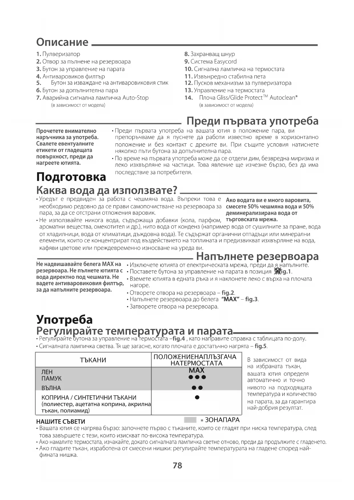 - Регулирайте температурата според тъканта за гладене.• Поставете бутона за управление на парата върху позиция – fig.1.• Можете да гладите, когато сигналната лампичка изгасне. Допълнителни функции Плоча Gliss/Glide Protect
