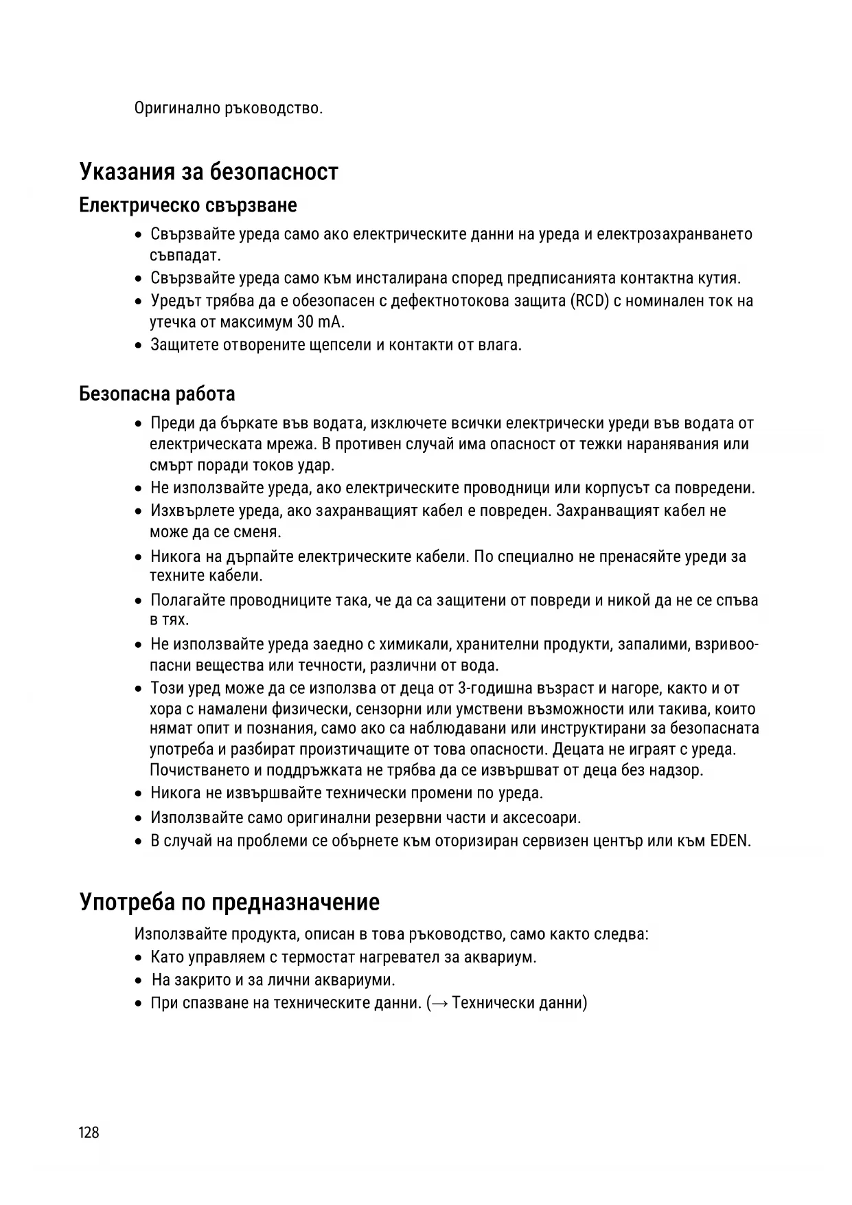 Прочетете ръководството за употреба.130 Монтаж и свързване Желаната температура на водата може да бъде постигната само ако отоплител- ната мощност съответства на количеството вода в аквариума и е поставена в зона с добра циркулация на водата. (→ Препоръчителна отоплителна мощност)