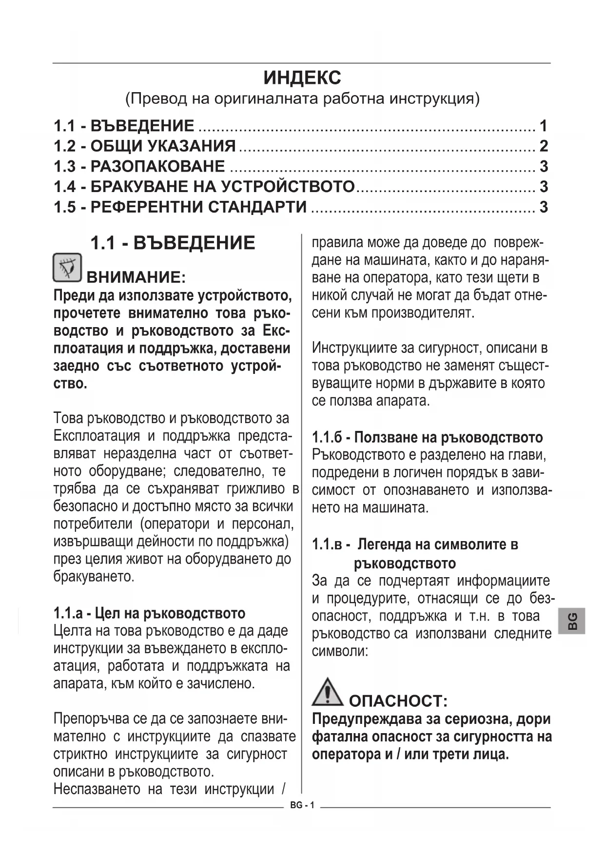 Целта на това ръководство е да даде инструкции за въвеждането в експло- атация, работата и поддръжката на апарата, към който е зачислено. Препоръчва се да се запознаете вни- мателно с инструкциите да спазвате стриктно инструкциите за сигурност описани в ръководството. Неспазването на тези инструкции / правила може да доведе до повреж- дане на машината, както и до нараня- ване на оператора, като тези щети в никой случай не могат да бъдат отне- сени към производителят. Инструкциите за сигурност, описани в това ръководство не заменят същест- вуващите норми в държавите в която се ползва апарата.