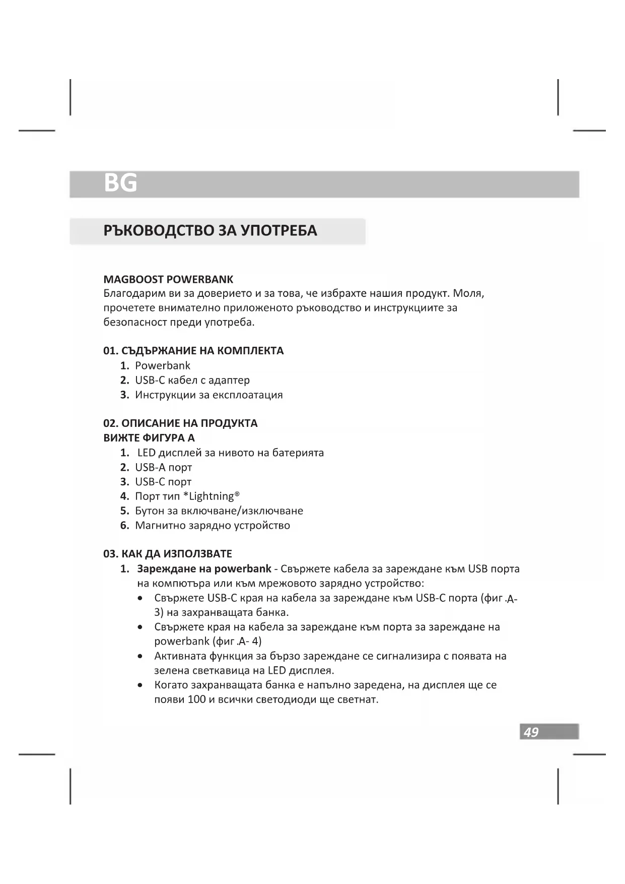 РЪКОВОДСТВО ЗА УПОТРЕБА MAGBOOST POWERBANK Благодарим ви за доверието и за това, че избрахте нашия продукт. Моля, прочетете внимателно приложеното ръководство и инструкциите за безопасност преди употреба.