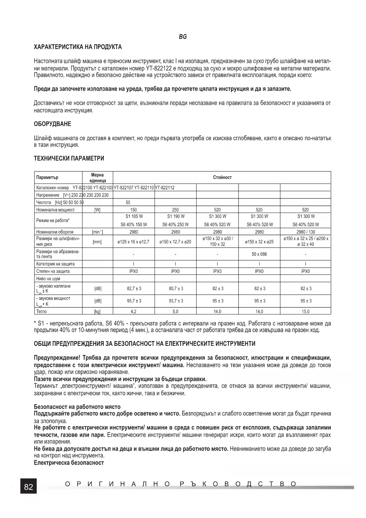 ХАРАКТЕРИСТИКА НА ПРОДУКТА Настолната шлайф машина е преносим инструмент, клас I на изолация, предназначен за сухо грубо шлайфане на метал- ни материали. Продуктът с каталожен номер YT-822122 е подходящ за сухо и мокро шлифоване на метални материали. Правилното, надеждно и безопасно действие на устройството зависи от правилната експлоатация, поради което: Преди да започнете използване на уреда, трябва да прочетете цялата инструкция и да я запазите. Доставчикът не носи отговорност за щети, възникнали поради неспазване на правилата за безопасност и указанията от настоящата инструкция.