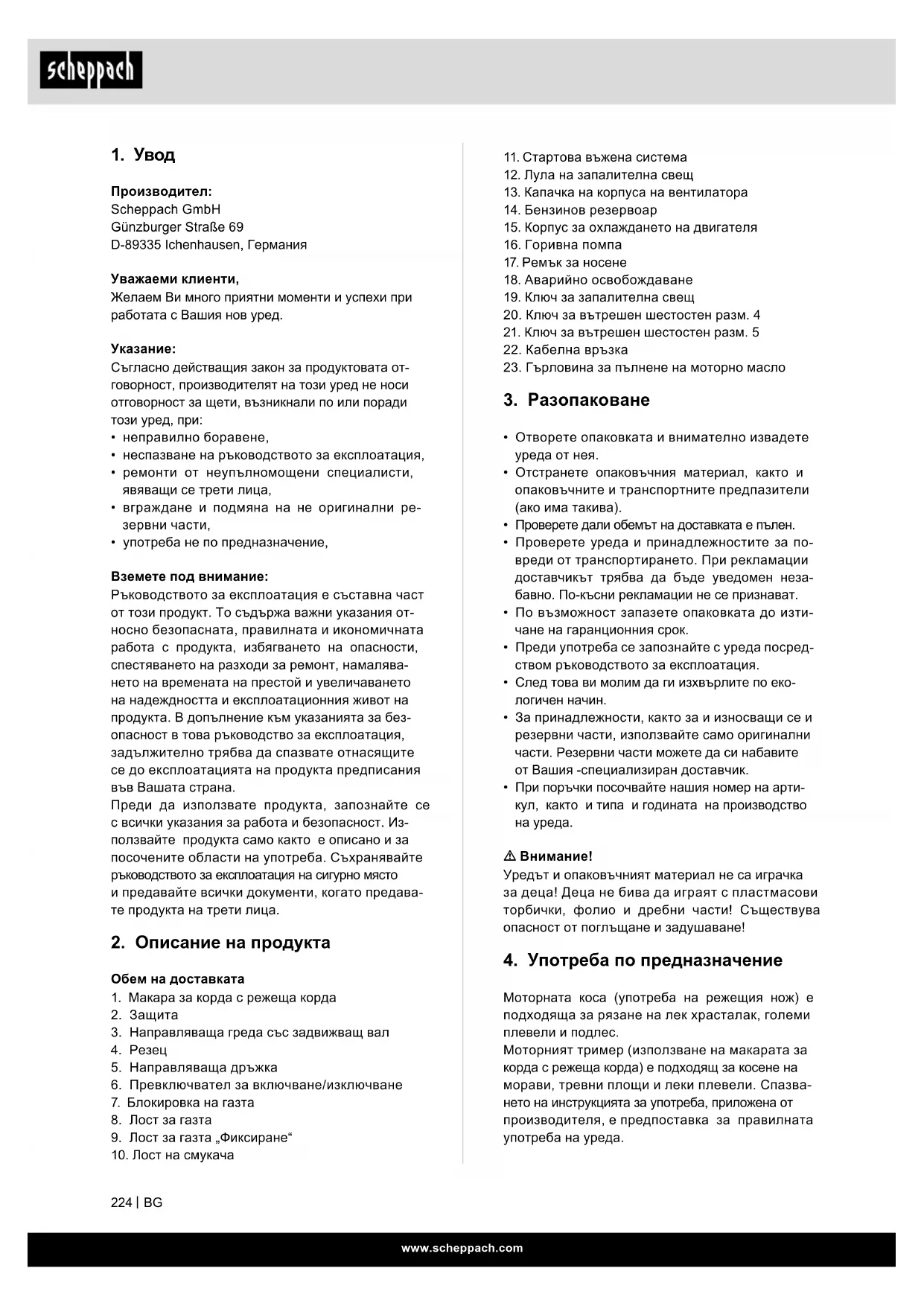 Тример за трева Гарантирано ниво на звукова мощност Бутон за запалване, бензинова помпа Дросел, включване (студен старт) Дросел, изключване (топъл старт) Проверете нивото на маслото. Продуктът отговаря на приложимите сръбски директиви. Продуктът отговаря на приложимите европейски директиви.www.scheppach.com