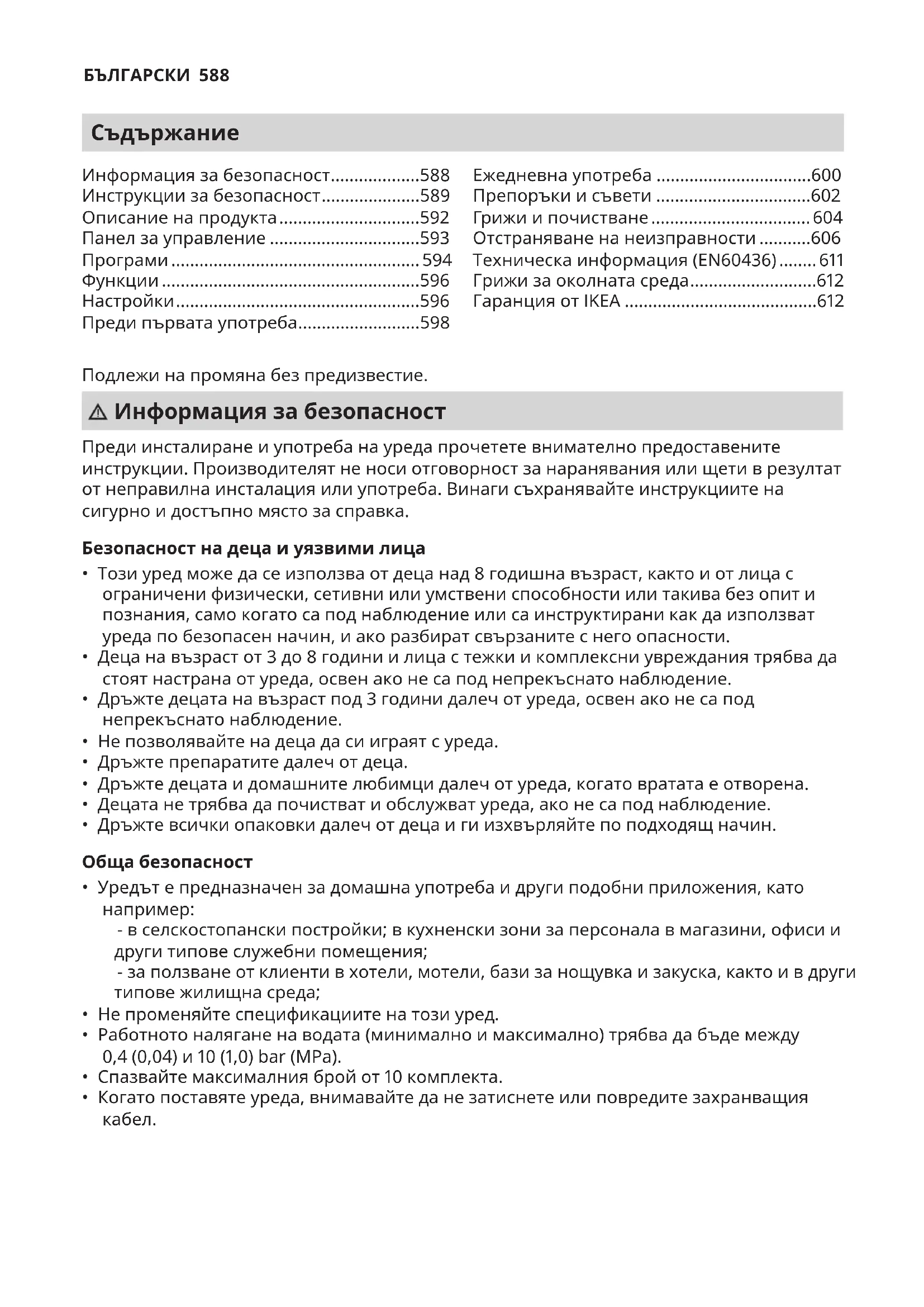 Изключено състояние 0,49 W Отложен старт 1,00 W a) За програмата ECO b) Максималният брой комплекти за миене е 10. Вижте примерите за зареждане на кошниците в началото на това кратко ръководство. Правилното зареждане спомага за икономия на енергия и вода. Ако не са правилно подредени съдовете може да бъдат измити добре. c) Консумацията на електроенергия в kWh за един цикъл е изчислена за програма ECO с подаване на студена вода. Реалната консумация на електроенергия зависи от начина на използване на уреда. d) Консумацията на вода в литри за един цикъл е изчислена за програма ECO. Реалната консумация на вода зависи от начина на използване на уреда и от твърдостта на водата.БЪЛГАРСКИ 612 ВръзкакъмбазатаданниEPRELнаЕС QR кодът на енергийния етикет, поставен на уреда, представлява връзка към уеб страницата за регистрация на този уред в базата данни EPREL на ЕС. Запазете енергийния етикет за справка, заедно с ръководството за употреба и всички останали документи, доставени с уреда. Информация, свързана с функционалните характеристики на продукта, можете да намерите в базата данни EPREL на ЕС на адрес: https://eprel.ec.europa.eu, като използвате името на модела и номера на продукта, които ще намерите на информационната табелка на уреда. За справка вижте раздел „Описание на продукта“. По-подробна информация относно енергийния етикет ще намерите на адрес: www.theenergylabel.eu. Грижизаоколнатасреда Рециклирайте материалите, отбелязани със символа . Поставете опаковките в съответните контейнери за рециклиране. Помогнете за опазване на околната среда и здравето на хората чрез рециклиране на отпадъците от електрически и електронни уреди. Не изхвърляйте уреди, обозначени със символа , заедно с битовите отпадъци. Върнете продукта в местния завод за рециклиране или се свържете със съответната общинска служба. ГаранцияотIKEA ДокогаевалиднагаранциятанаIKEA? Тази гаранция е валидна за срок от 5 години, считано от датата на първоначалната покупка. За доказателство за покупката се изисква оригиналната касова бележка. Ако уредът бъде ремонтиран, докато е в гаранция, това няма да удължи гаранционния срок. Койизвършваремонта? Обслужването се осигурява от доставчик на сервизно обслужване на IKEA чрез собствени сервизи или сервизна мрежа от упълномощени партньори. Каквопокриватазигаранция? Гаранцията покрива повреди на уреда, които са причинени от неизправна конструкция или дефект на материала считано от датата на закупуване от IKEA. Тази гаранция важи само за уреди за домашна употреба. Изключенията са посочени под заглавието „Какво не покрива тази гаранция?“ В рамките на гаранционния период се покриват разходите за отстраняване на повредата, напр. ремонт, резервни части, труд и пътуване, при условие че уредът е достъпен за ремонт без специални разходи. При тези условия се прилагат указанията на ЕС (Директива 99/44/ЕО) и съответните местни разпоредби. Сменените части стават собственост на IKEA.БЪЛГАРСКИ 613 КаквоправиIKEAзаотстраняванена