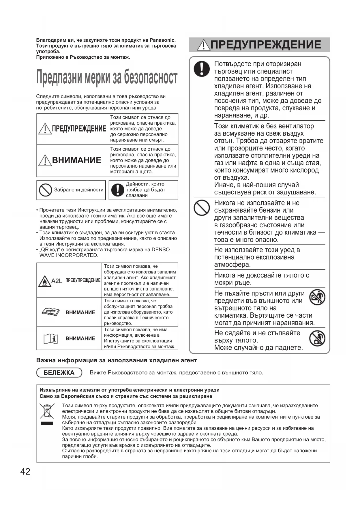 Σε περίπτωση που συμβεί διακοπή ρεύματος ενώ λειτουργεί η μονάδα Η μονάδα θα συνεχίσει τη λειτουργία αυτόματα. Θα χρησιμοποιηθούν οι ρυθμίσεις λειτουργίας που υπήρχαν πριν τη διακοπή ρεύματος. Αυτό το κλιματιστικό ενσωματώνει ένα βιοκτόνο προϊόν.Οι ελεύθερες ρίζες που παράγονται από μια συσκευή που βρίσκεται ενσωματωμένη στο κλιματιστικό έχουν τη δυνατότητα να αναστέλλουν τους επιμολυντές, όπως ορισμένους τύπους βακτηριδίων, ιών, μούχλας.Ενεργές ουσίες: ελεύθερες ρίζες που παράγονται in situ από τον αέρα περιβάλλοντος ή το νερό Χρήση: Αυτή η λειτουργία της συσκευής μπορεί να ενεργοποιηθεί / απενεργοποιηθεί με το κουμπί εικονιδίου «nanoe X» ή τις ρυθμίσεις τηλεχειριστηρίου εφόσον δεν υπάρχει κουμπί με το εικονίδιο «nanoe X». Ανατρέξτε στην ενότητα «Τρόπος χρήσης» για περισσότερες λεπτομέρειες. Σαρώστε τον κώδικα QR στην πρώτη σελίδα και διαβάστε τις αναλυτικές οδηγίες χρήσης. Μηχανισμός λειτουργίας 00_360661_all.indb 4100_360661_all.indb 41 2024/10/07 17:19:382024/10/07 17:19:3842 Благодарим ви, че закупихте този продукт на Panasonic.Този продукт е вътрешно тяло за климатик за търговска употреба.Приложено е Ръководство за монтаж. Предпазни мерки за безопасност Следните символи, използвани в това ръководство ви предупреждават за потенциално опасни условия за потребителите, обслужващия персонал или уреда: ПРЕДУПРЕЖДЕНИЕ Този символ се отнася до рискована, опасна практика, която може да доведе до сериозно персонално нараняване или смърт. Този символ се отнася до рискована, опасна практика, която може да доведе до персонално нараняване или материална щета.Забранени дейностиДейности, които трябва да бъдат спазвани ПРЕДУПРЕЖДЕНИЕ Важна информация за използвания хладилен агентБЕЛЕЖКА Вижте Ръководството за монтаж, предоставено с външното тяло.Изхвърляне на излезли от употреба електрически и електронни уредиСамо за Европейския съюз и страните със системи за рециклиранеТози символ върху продуктите, опаковката и/или придружаващите документи означава, че изразходваните електрически и електронни продукти не бива да се изхвърлят в общите битови отпадъци.Моля, предавайте старите продукти за обработка, преработка и рециклиране на компетентните пунктове за събиране на отпадъци съгласно законовите разпоредби.Като изхвърляте тези продукти правилно, Вие помагате за запазване на ценни ресурси и за избягване на евентуално вредните влияния върху човешкото здраве и околната среда.За повече информация относно събирането и рециклирането се обърнете към Вашето предприятие на място, предлагащо услуги във връзка с изхвърлянето на отпадъците. Съгласно разпоредбите в страната за неправилно изхвърляне на тези отпадъци могат да бъдат наложени парични глоби.• Прочетете тези Инструкции за експлоатация внимателно, преди да използвате този климатик. Ако все още имате някакви трудности или проблеми, консултирайте се с вашия търговец.• Този климатик е създаден, за да ви осигури уют в стаята. Използвайте го само по предназначение, както е описано в тези Инструкции за експлоатация.• „QR код“ е регистрираната търговска марка на DENSO WAVE INCORPORATED.ПРЕДУПРЕЖДЕНИЕТози символ показва, че оборудването използва запалим хладилен агент. Ако хладилният агент е протекъл и е наличен външен източник на запалване, има вероятност от запалване.ВНИМАНИЕТози символ показва, че обслужващият персонал тряб