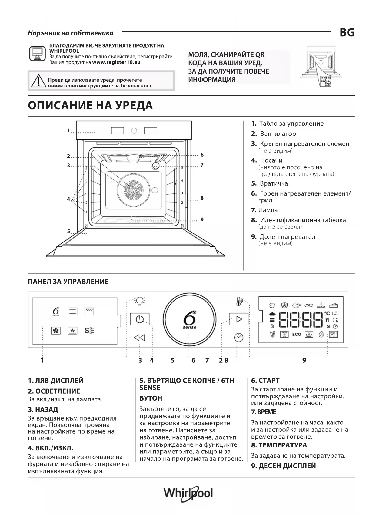 - Alternatively, contact our After-sales Service (See phone number in the warranty booklet). When contacting our After- sales Service, please state the codes provided on your product's identi cation plate. ®/TM/© 2025 Whirlpool. Produced under license.BG Наръчник на собственика БЛАГОДАРИМ ВИ, ЧЕ ЗАКУПИХТЕ ПРОДУКТ НА WHIRLPOOL За да получите по-пълно съдействие, регистрирайте Вашия продукт на www.register10.eu Преди да използвате уреда, прочетете внимателно инструкциите за безопасност. ОПИСАНИЕ НА УРЕДА ПАНЕЛ ЗА УПРАВЛЕНИЕ