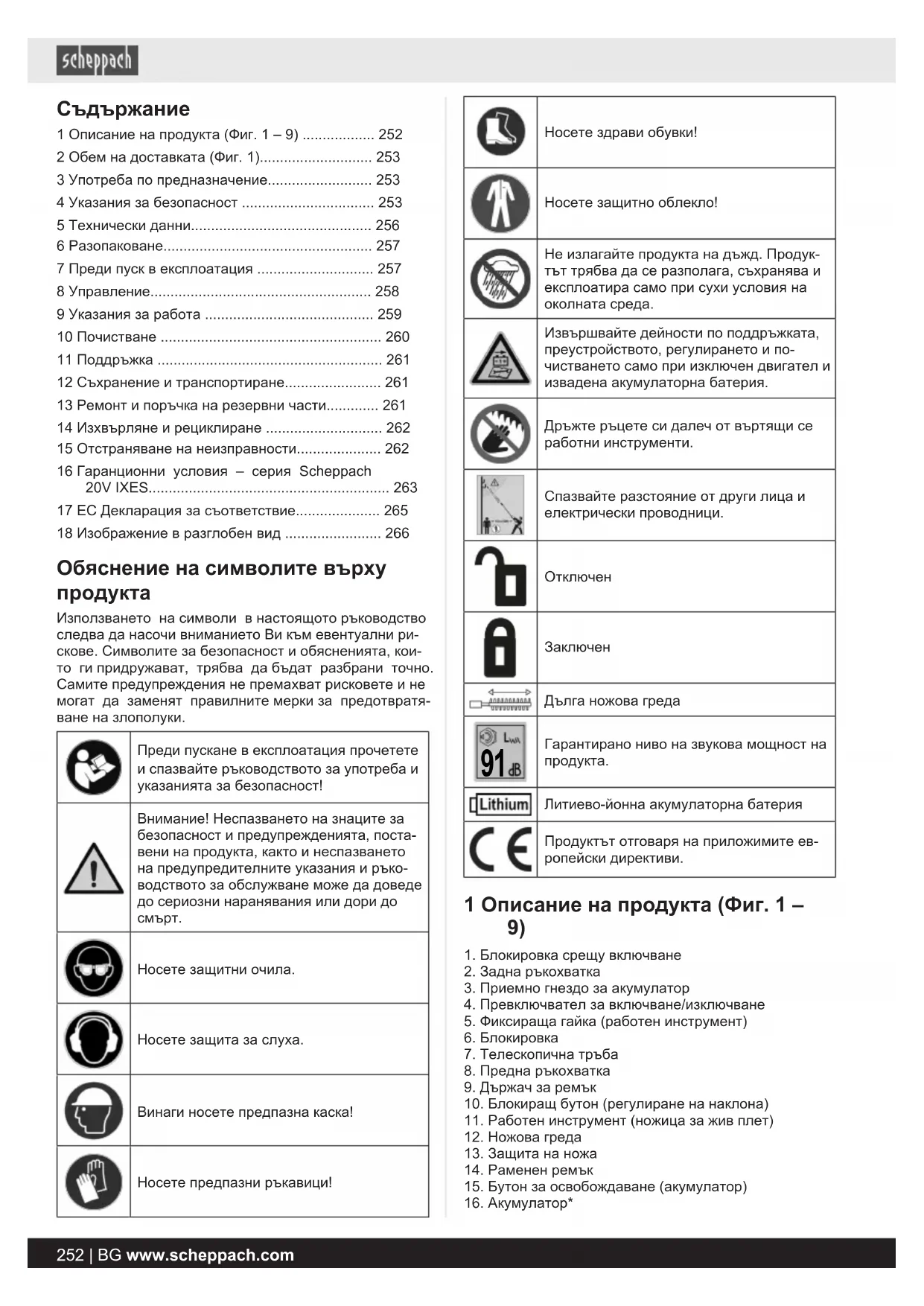 покриват или вече не се покриват от гаранцията, ще бъдат ремонтирани срещу заплащане. Ако по- искате от нашия сервизен център, можете да из- пратите дефектните продукти за оценка на разхо- дите и, ако е необходимо, да дадете писмено раз- решение на сервизния център за ремонт (по поща- та, имейл). Няма да се извършва по-нататъшна обработка без одобрение за ремонт. Гаранционните условия важат само в текущата вер- сия към момента на рекламацията и могат да бъдат намерени на нашата начална страница (www.scheppach.com). При преводите немската вер- сия винаги е с предимство. Scheppach GmbH · Günzburger Str. 69 · 89335 Ichenhausen (Германия) 264 | BG www.scheppach.comТелефон: +800 4002 4002 · Имейл: customerservice.BG@scheppach.com · Интернет: https://www.scheppach.com Запазваме си правото на промени на настоящите га- ранционни условия по всяко време без предизвестие. 17 ЕС Декларация за съответствие Превод на оригиналната декларация на съответствие Производител: Scheppach GmbH Günzburger Straße 69 D-89335 Ichenhausen Ние декларираме на своя отговорност, че описаният тук продукт отговаря на приложимите директиви и